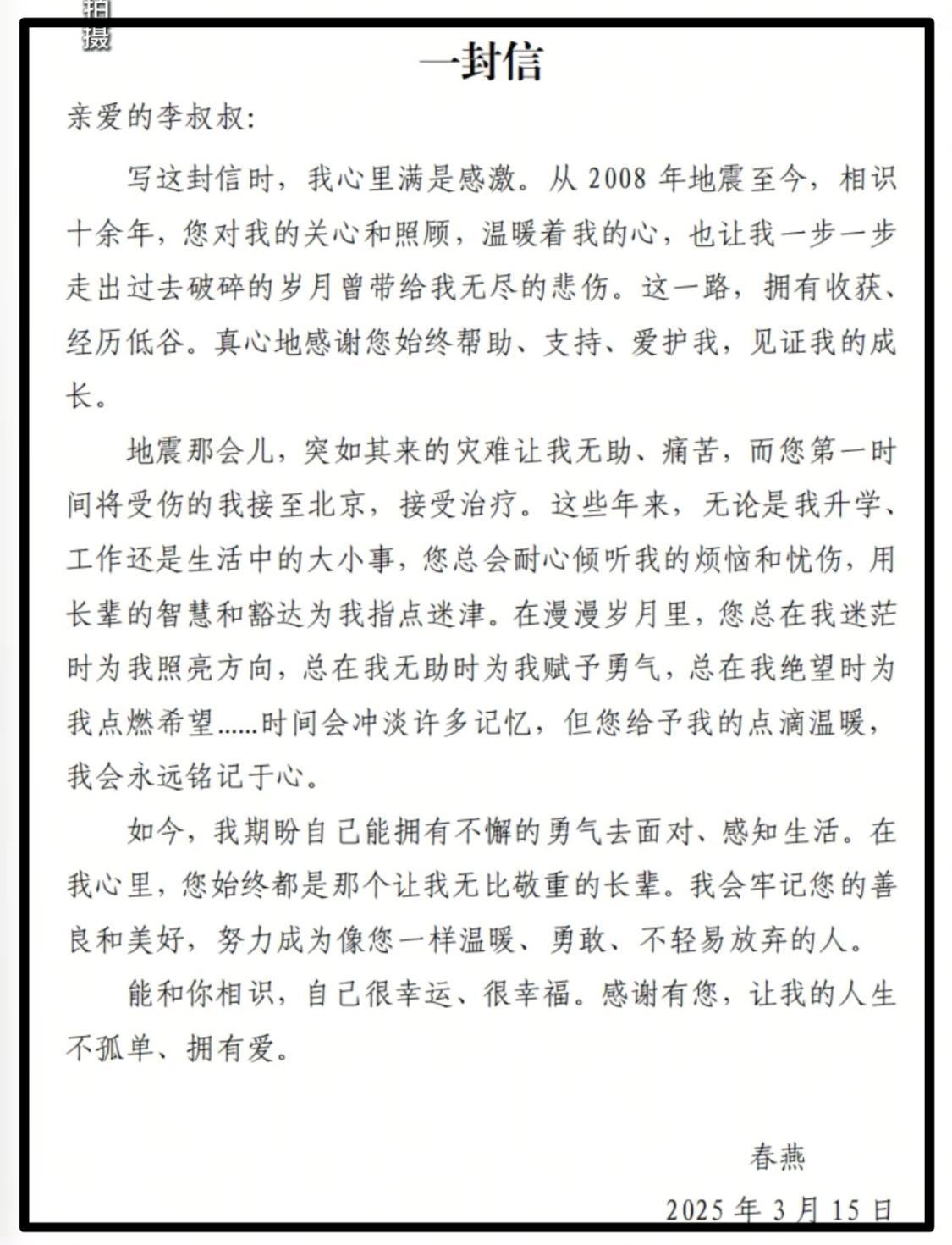 李亚鹏藏了17年的秘密终于揭开了,他竟然在四川还有一个女儿! 大家都知道李亚鹏有和王菲亲生女儿李嫣,和那个什么哈金生的小女儿夏夏,还有一个前妻王菲带过来的继女窦靖童,也喊他爸爸。 但是除了这三个之外,李亚鹏说他在四川还有一个女儿! 这件事是在17年前,汶川大地震,很多教室坍塌,有个叫朱春燕的女孩腿被压断了,李亚鹏王菲夫妇知道后,收养了她。 李亚鹏对她很好,是正儿八经的抚养资助她。朱春燕也没有辜负这份善意,尽管身有残疾,最后凭借自己努力,考上了 985 大学。 最值得一提的是,前几年李亚鹏投资生意失败,大学毕业后的朱春燕看到新闻上说李亚鹏欠了很多钱,还说要给人下跪,朱春燕竟然把自己的工资一万多微信给李亚鹏! 李亚鹏当然没有收,但是这份情感,让李亚鹏也很感动。所以他去四川参加活动他都会去看看朱春燕,看看这个特殊的女儿!