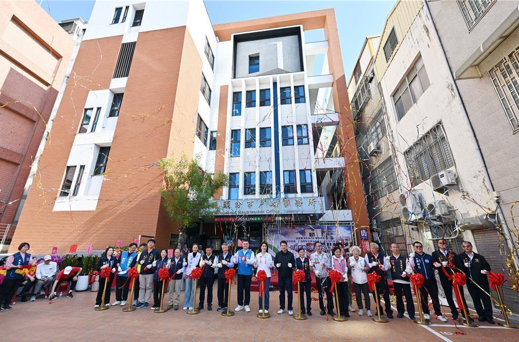 苗栗县头份市户政事务所新建行政大楼落成启用,县长钟东锦(右十)率各界人士剪彩,象征户政服务与公共设施全面升级。