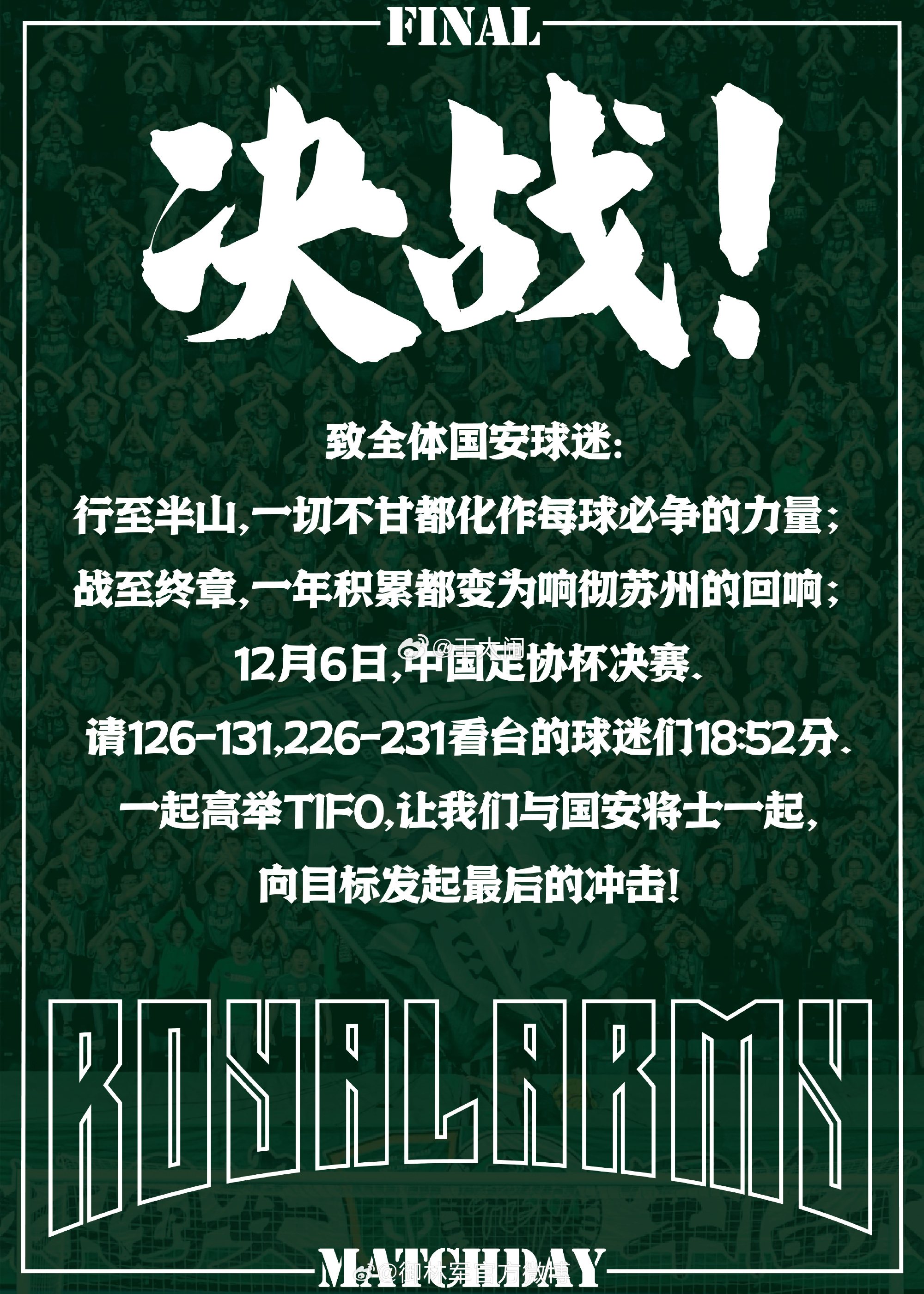 热点现场北京国安京豫现场球迷比例1比3 御林军今晚亮绝活2025中国足协杯决赛 6日中午,随着最后几批京城球迷乘坐高铁抵达苏州,亲临2025中国足协杯决赛现场的国安远征军集结完毕。据统计,本次共有7300余名国安球迷现场观战,但河南球迷多达20000余人。尽管人数不占优势,但国安球迷组织今晚已准备好了绝活,要把中立场地变为国安主场。苏州奥体中心体育场设计容量为45000个座席,本次足协杯决赛,刨去安保和隔离区域,预计开放座位不到40000个,京豫两地球迷总数约30000人,另有几千本地和中立球迷。对于1比3这种人数比例上的劣势,国安球迷组织御林军负责人张悦表示,会把这场比赛当作客场,御林军将用整齐划一的歌唱、鼓点、口号,以及赛前的看台TIFO来展示自己的球迷文化和助威方式。他和小伙伴们已准备好了现场TIFO所需物料,今晚,在苏州奥体中心体育场的126至131看台、226至231看台,10个看台上的4000名国安球迷将联手拼出国安俱乐部吉祥物京狮的绿色面部图像,并配合看台前方“国安永远争第一”的巨型横幅,为场上作战的国安球员营造出主场般的氛围。北京国安 一位球迷骨干说,虽然对方人数众多,但大部分是散客,就球迷组织之间的助威能力比拼,御林军无惧挑战。闹太talk
