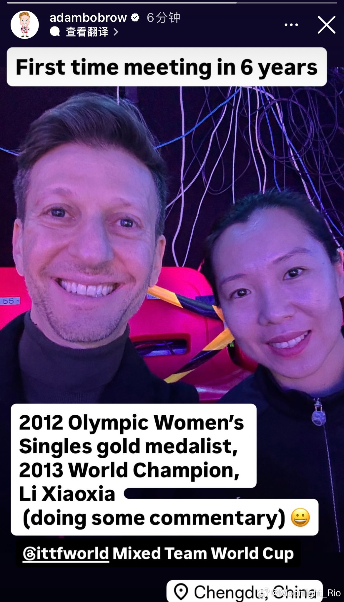 2025成都混合团体世界杯 Adam晒与李晓霞合影📸️时隔6年的首次见面2012年奥运会女单金牌得主、2013年世乒赛冠军,李晓霞(正在担任解说)😀