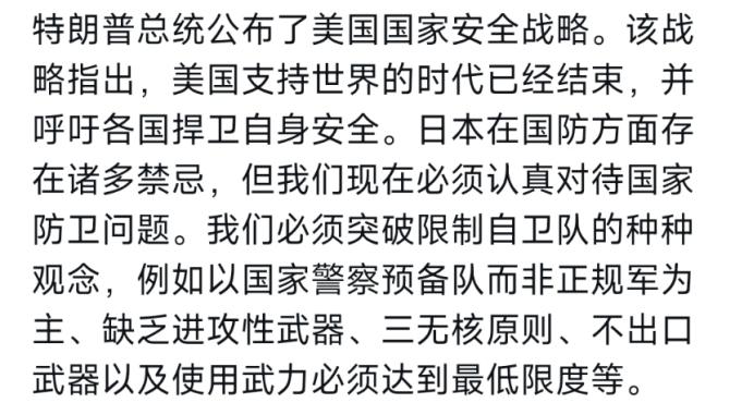 12月6日,日本航空自卫队前参谋长田母神俊雄今天发文:“特朗普公布了美国国家安全战略。呼吁各国捍卫自身安全,而日本在国防存在诸多禁忌,日本必须突破限制自卫队的种种观念,例如非正规军,无核三原则。” 说白了,日本这次发文,还是想找理由,将自己的国家从战败国,变成“正常国”,从而能让他们扩充军队,复活军国主义,并且还对核武器一直有着执念。 要知道,二战,美国向日本投放了两颗原子弹,日本死伤惨重,到现在日本还受着核污染的侵害,而这也使他们对拥有核武器的愿望,越来强烈,虽然表面上没有制造,但是已经在边缘不断地开始了试探,日本现在在本土储存了大量核武器的制造原料,就是最好的证明。 说实话,这几年日本对复活军国主义和拥有核武器,做出了不少努力,甚至还在一直在增加这军队的投入资金,之前一直干涉中国内政,为的就是想用着民族仇恨,让中国能先行对他们动用武力,好让他们用自卫的借口,打破约束。 可是万万没想到,中国不但没有动用武力,还拿出了二战秩序,打破了日本这一幻想,而这次的表态,是又想从其他地方找突破口。 说到底,日本借着特朗普的安全战略喊着突破禁忌,实际上是精心包装的扩军阴谋,是他们步步为营的试探,为此周边国家需要高度警惕,形成共识,坚决反对军国主义复苏,这既是守护战后和平秩序的底线,也是捍卫地区稳定和安全的关键。