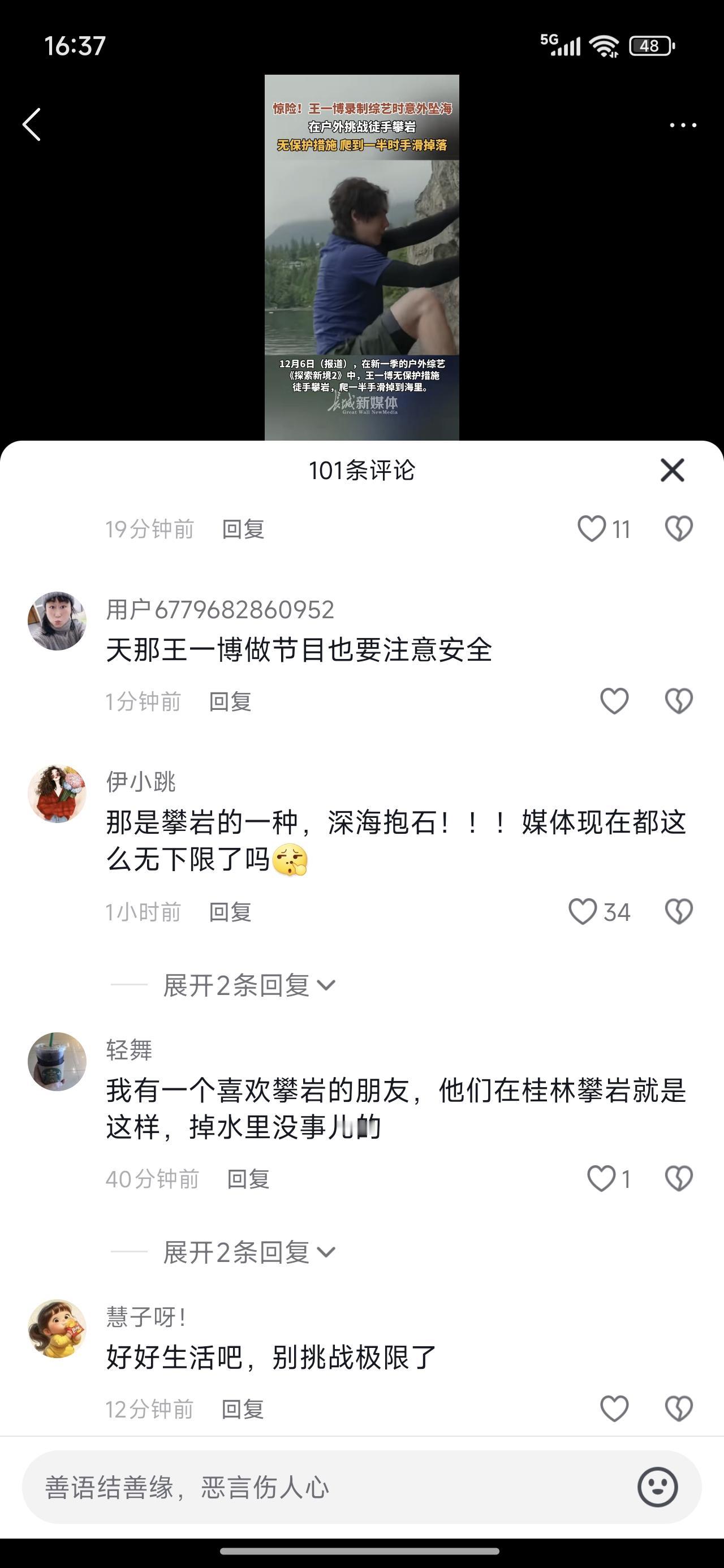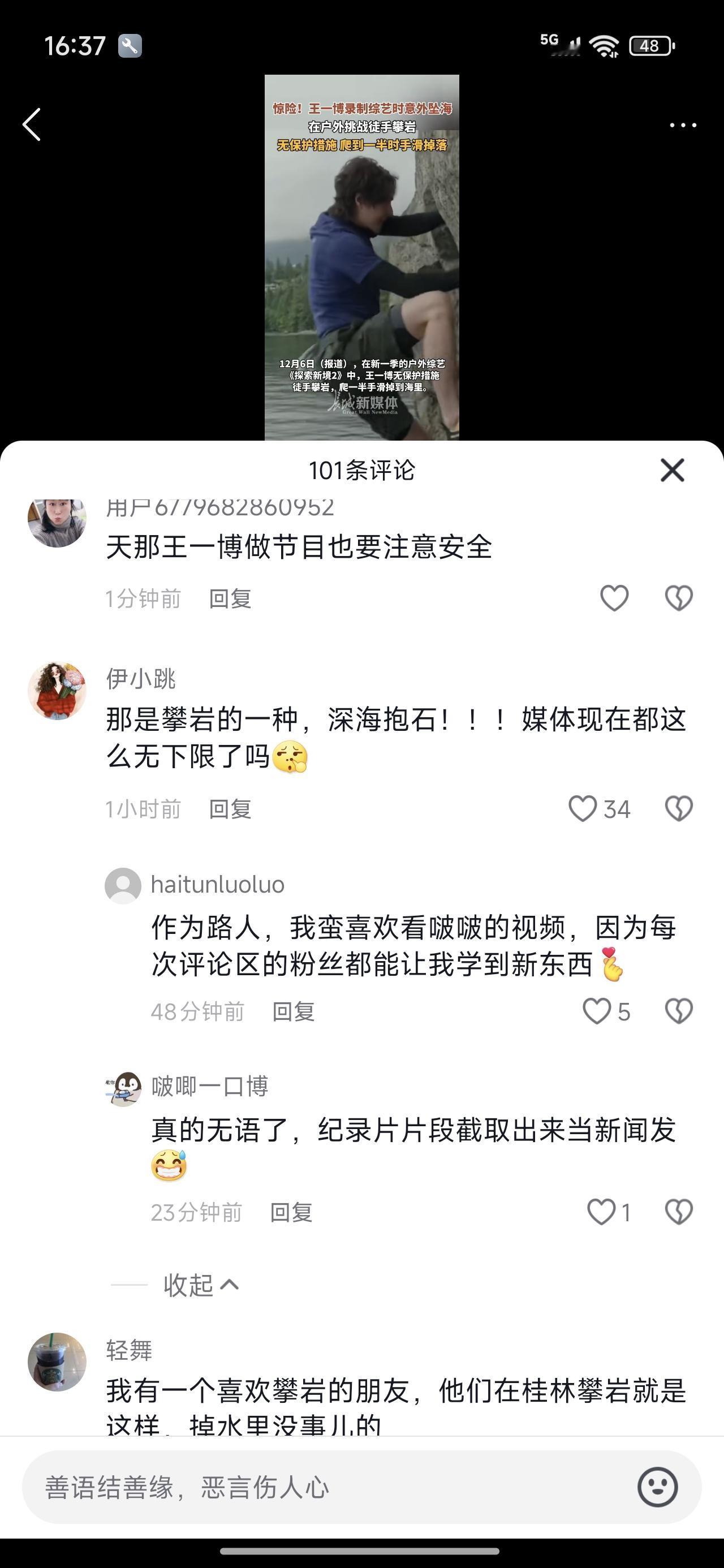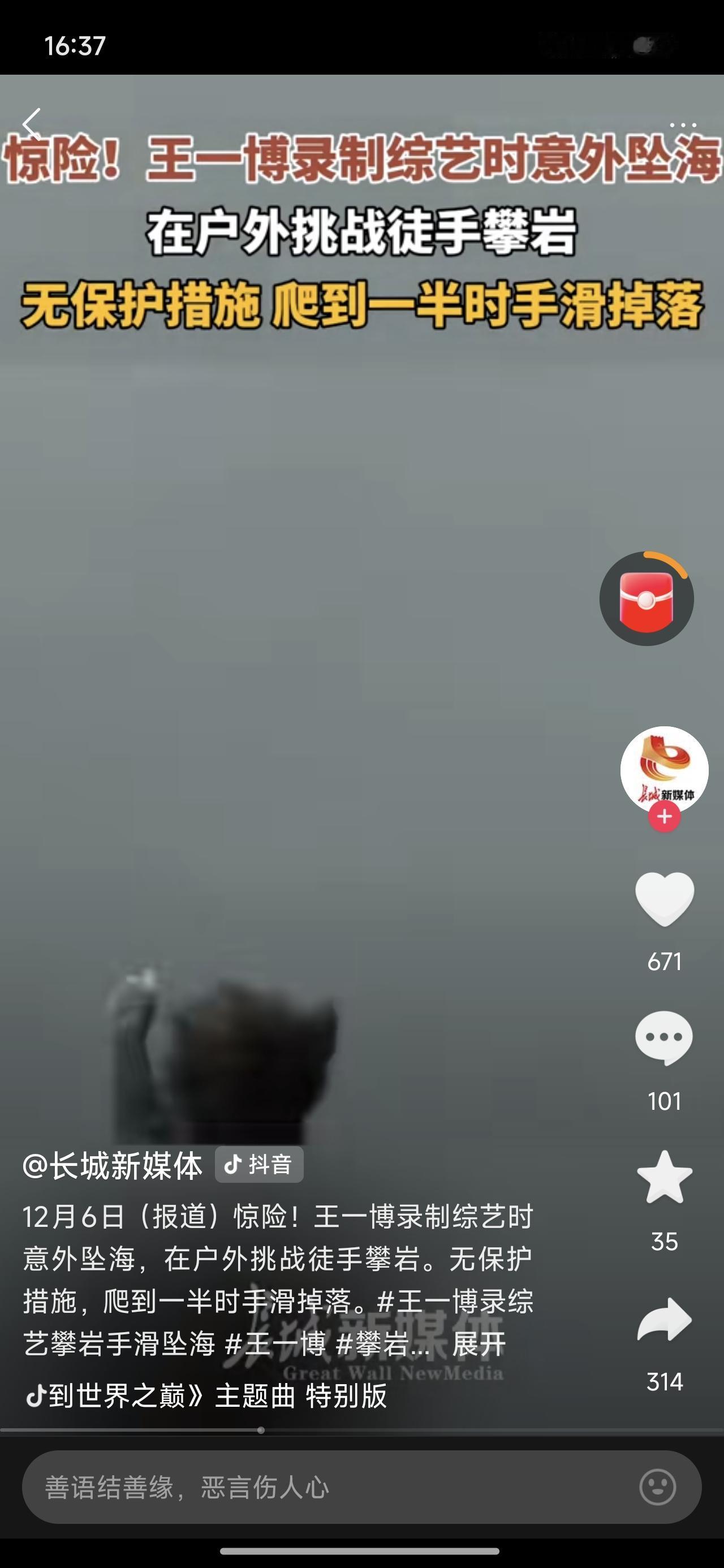 王一博攀岩不小心坠海? 一看这标题,我赶紧点进去看看,是摔哪了,要不要紧啊!王一博 王一博纪录片 哪知道人家只是在拍纪录片。 现在这自媒体能蹭的热度就一定用文字蹭上!真受不了了!一天天活的虚情假意的。不是这个明星离婚,就是那个明星出轨。好没意思啊! 在家把网拔了又怕错过千万富豪睁眼瞎爱上独居带娃吭哧瘪肚的我! 算了,睡一会儿吧!再吃肚子快炸了!王一博探险