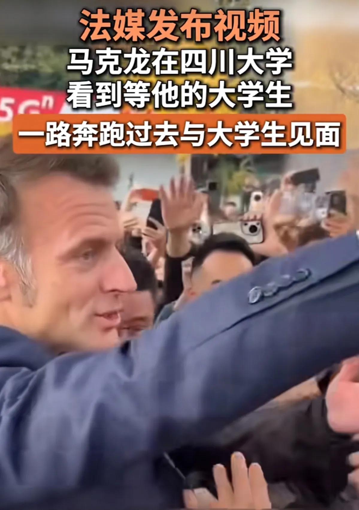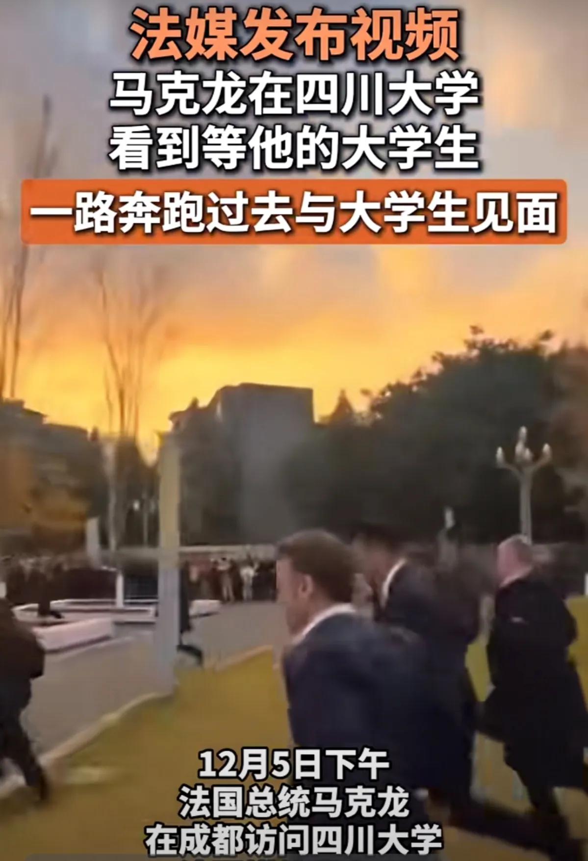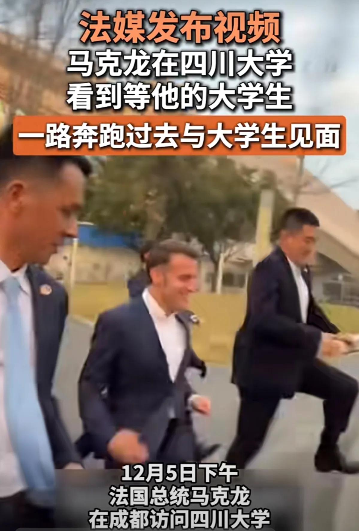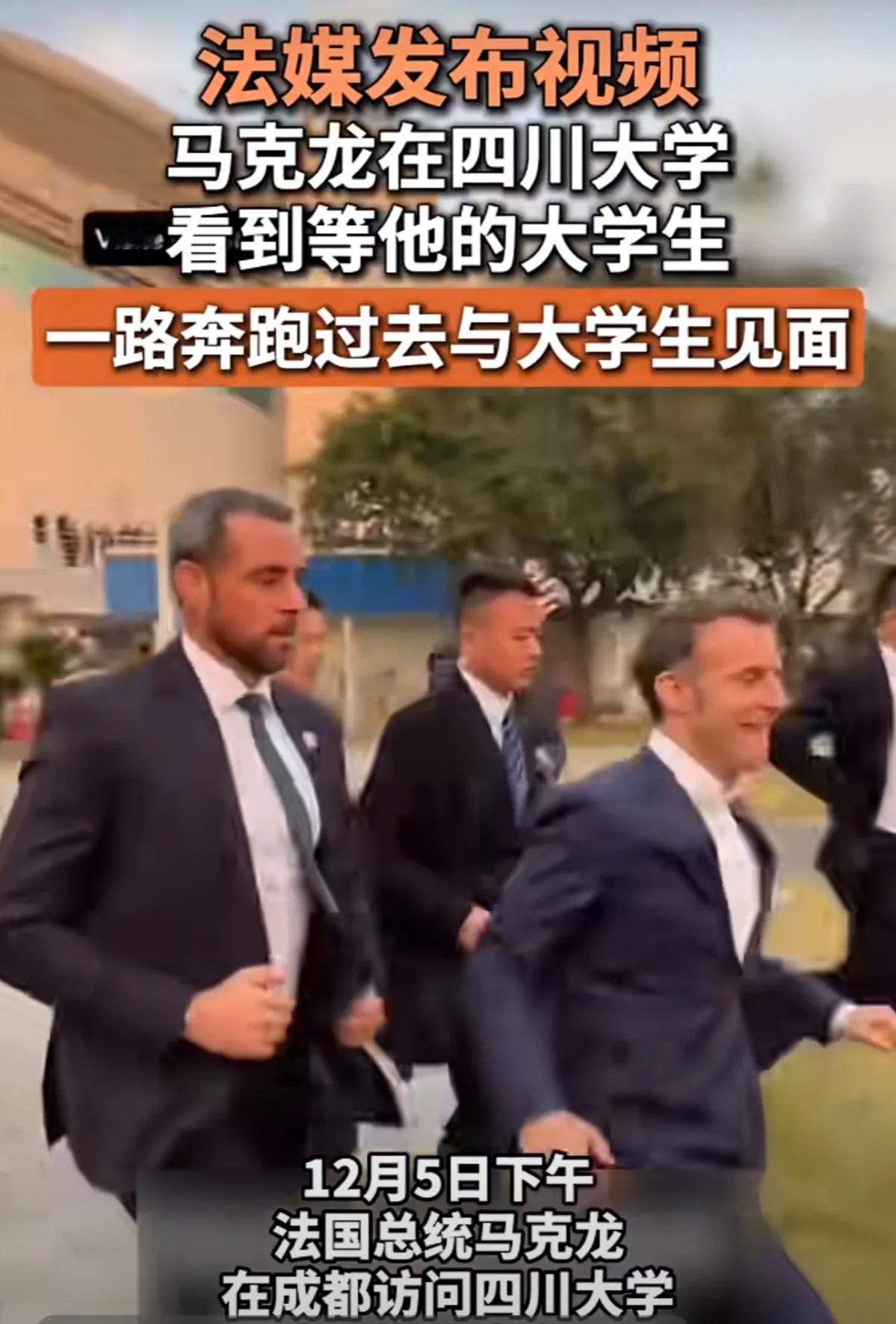马克龙跑得比保镖还快!谁来中国,都是满满的安全感 据环球时报12月6日报道,5日访问四川大学的法国总统马克龙,正在保镖的簇拥下走着,看到不远处聚集了一大批学生在等待,突然兴奋地跑了起来,一度跑得比保镖还快。 马克龙跑到学生们中间,热情地与学生们握手,学生们也纷纷拿起手机拍起照来。 来到中国,马克龙也显得像回家一样放松啊。看来,谁来中国,都是满满的安全感。 (来自环球时报)
