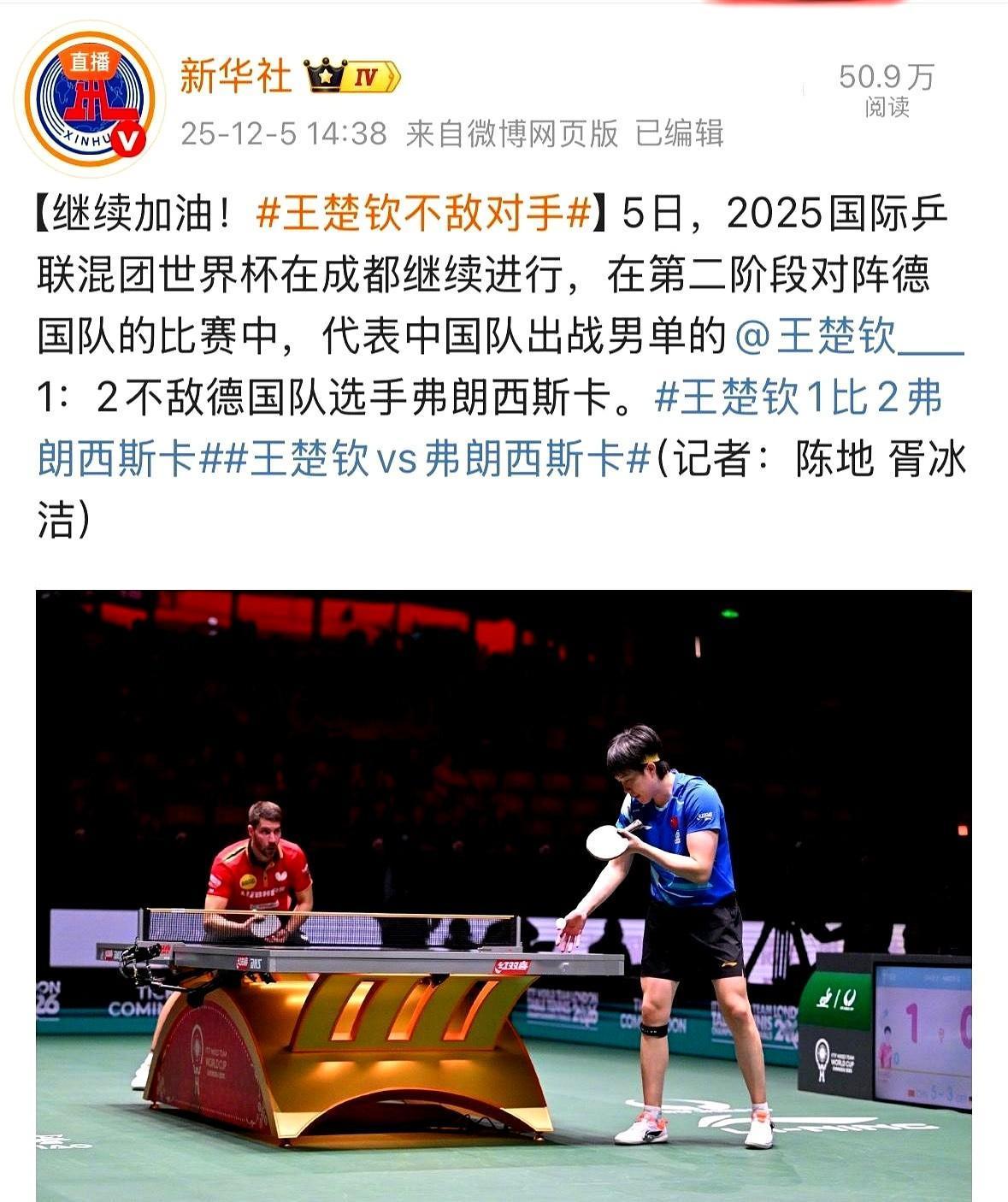 王楚钦这球输得我直接拍桌子! 现在网上吵翻了,有人说“大号居然打不过被小号松岛辉空零封两次的弗朗西斯卡,这反差比喝奶茶没珍珠还膈应”;也有人说“德国队最近跟开了挂似的,男队女队都往上冲,国乒是不是该把‘稳赢’俩字撕了?”;甚至有人说“去年世乒赛拿冠军的王楚钦去哪了?今天反手拧拉跟软面条似的!” 想当年他2024年世乒赛男单决赛踩着樊振东登顶时,那股子“我是王”的狠劲谁不佩服? 结果今天跟小弗打,前三板失误跟漏勺似的,正手进攻全打在界外——要知道小弗上次打马龙都差点赢,这哪是“软”? 分明是“飘”了! 但我真是笑了,说他状态下滑的纯属瞎掰! 王楚钦输就输在“轻敌”俩字! 觉得对手刚被松岛虐过,肯定好欺负,结果人家憋着劲儿拼你,能不输吗? 国乒这波“差点翻船”不是坏事,至少能打醒那些觉得“冠军稳拿”的人——德国队早不是当年的“陪跑户”了! 这事儿你们觉得是王楚钦飘了,还是德国队真的要抢国乒的“蛋糕”了?