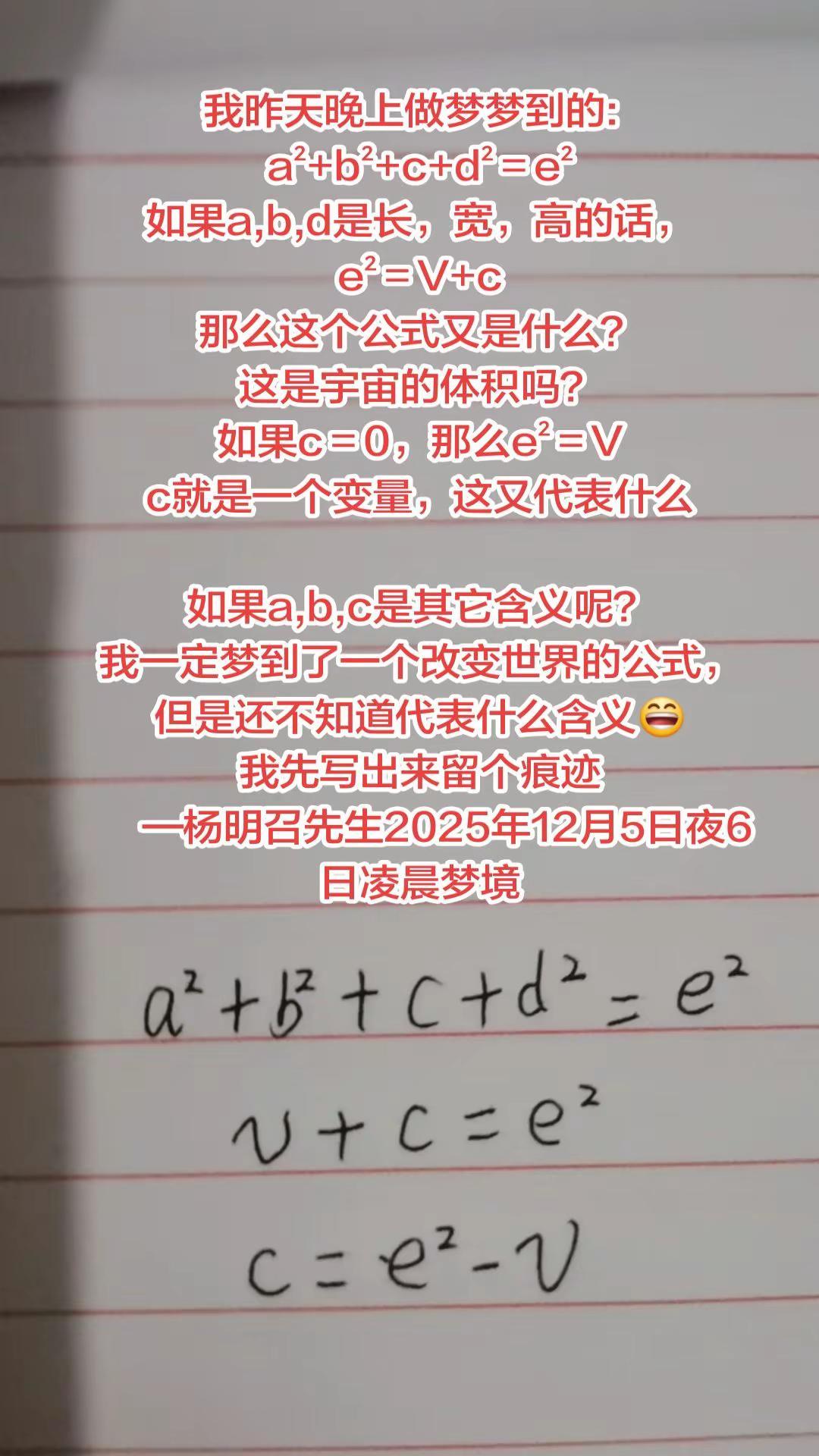 我昨天晚上做梦梦到的:a²+b²+c+d²=e²如果a,b,d是长,宽,高的话,e²=V+c那么这个公式又是什么?这是宇宙的体积吗?如果c=0,那么e²=Vc就是一个变量,这又代表什么如果a,b,c是其它含义呢?我一定梦到了一个改变世界的公式,但是还不知道代表什么含义😄我先写出来留个痕迹 —杨明召先生2025年12月5日夜6日凌晨梦境思维 手写 记录真实生活 梦境 数学