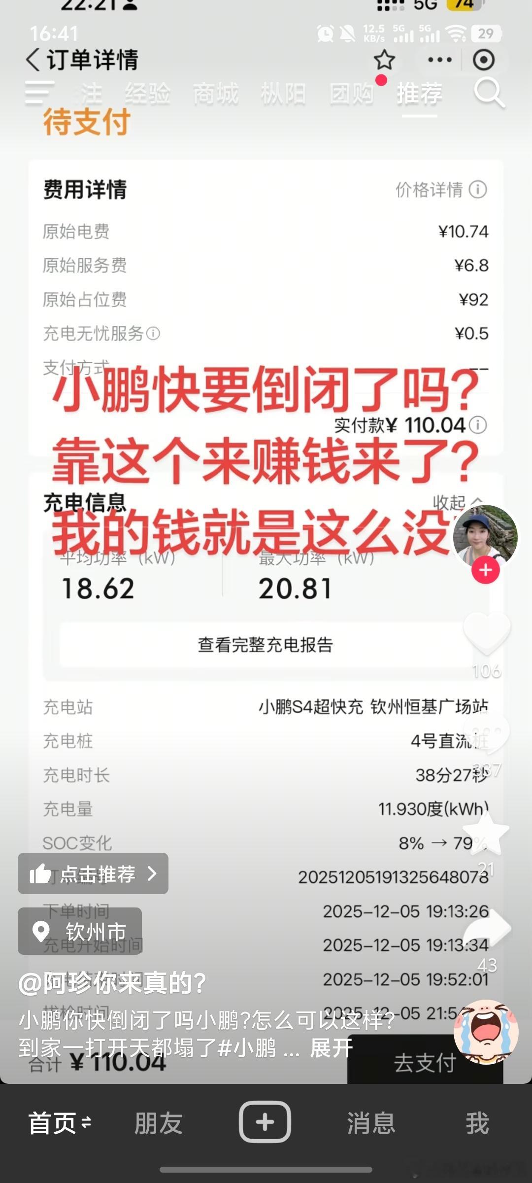 小鹏快倒闭了?竟然靠这个来赚钱?看到评论区都是说博主的我就放心了小鹏汽车新能源汽车新能源车充电超时该不该收取占位费小鹏汽车