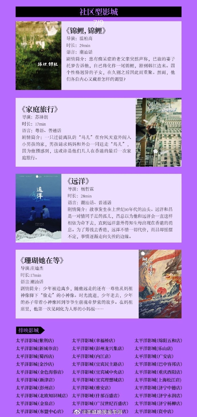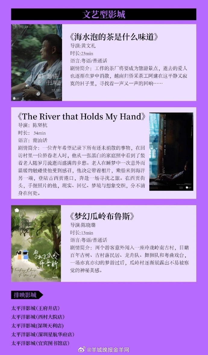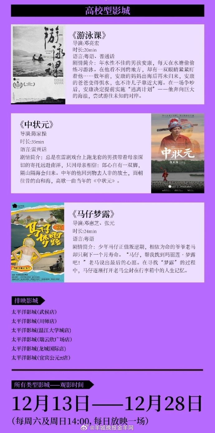 一项以光影连接城市、以短片共情生活的公益放映计划——“光影织梦·城市共生”山海计划短片公益放映活动,即将于12月13日至12月28日温暖开启。本次活动由羊城晚报报业集团与峨眉电影集团首次跨省联合主办,并作为山海计划首届成果回顾展,登陆全国13个城市、超过40家太平洋影城,展开为期半个月的公益巡回展映,欢迎预约观影!#山海计划##青年导演扶持计划##短片##太平洋影城#