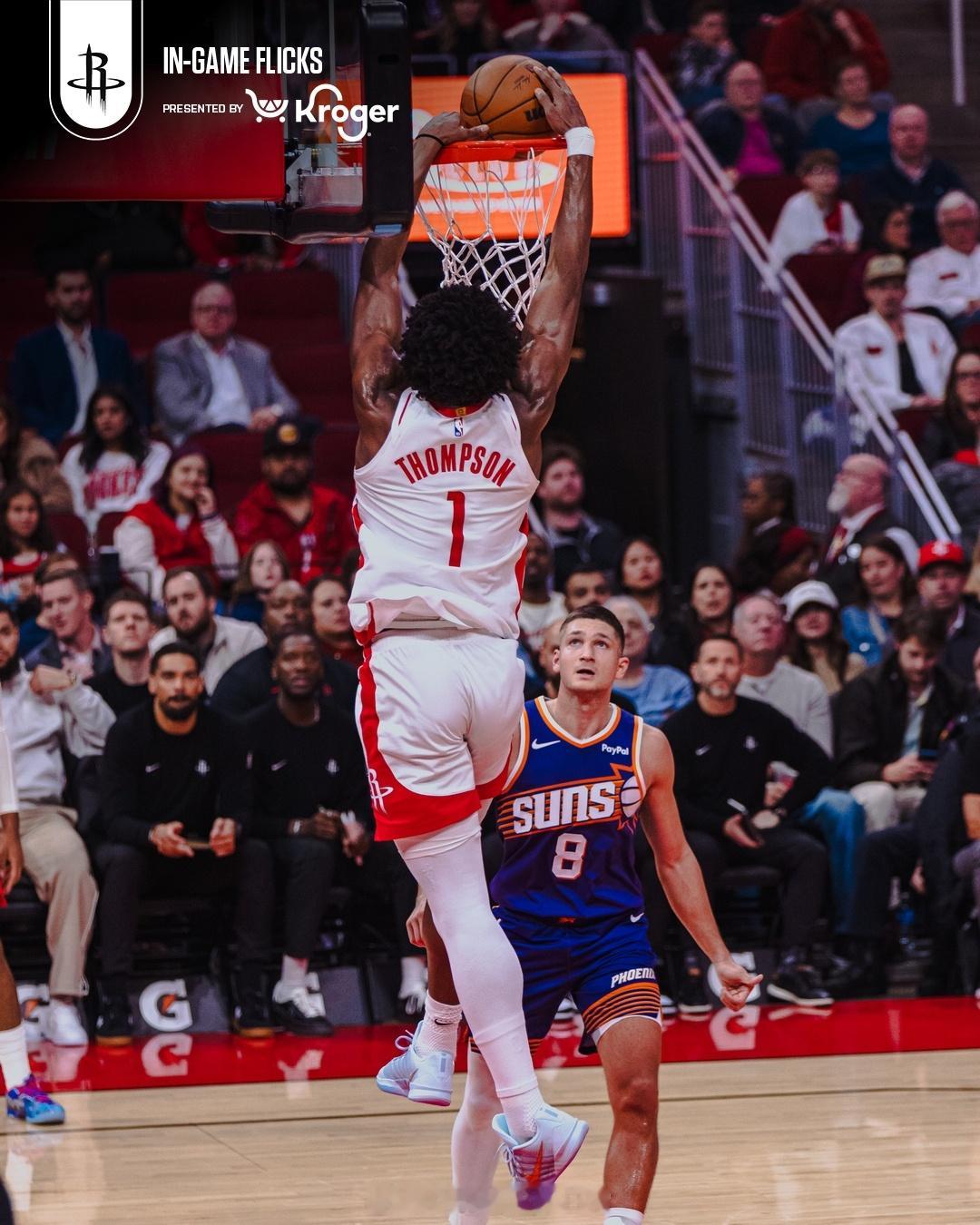 乌度卡谈到阿门,他说他对阿门在几次早期失误后仍然积极持球进攻的表现印象深刻。但这位后卫真正出彩的地方在于无球跑动,他在太阳特别关注杜兰特的情况下,通过与里德·谢泼德和阿隆·霍勒迪的配合,成功扮演了“扣篮手”的角色。乌度卡表示:“阿门设置掩护、空切,并找到其他位置的机会。因此,一如既往,他能做很多事情。在这三年里,他已经证明了这一点。他并不需要一直持球才能发挥出色。”阿门汤普森太阳vs火箭休斯顿火箭