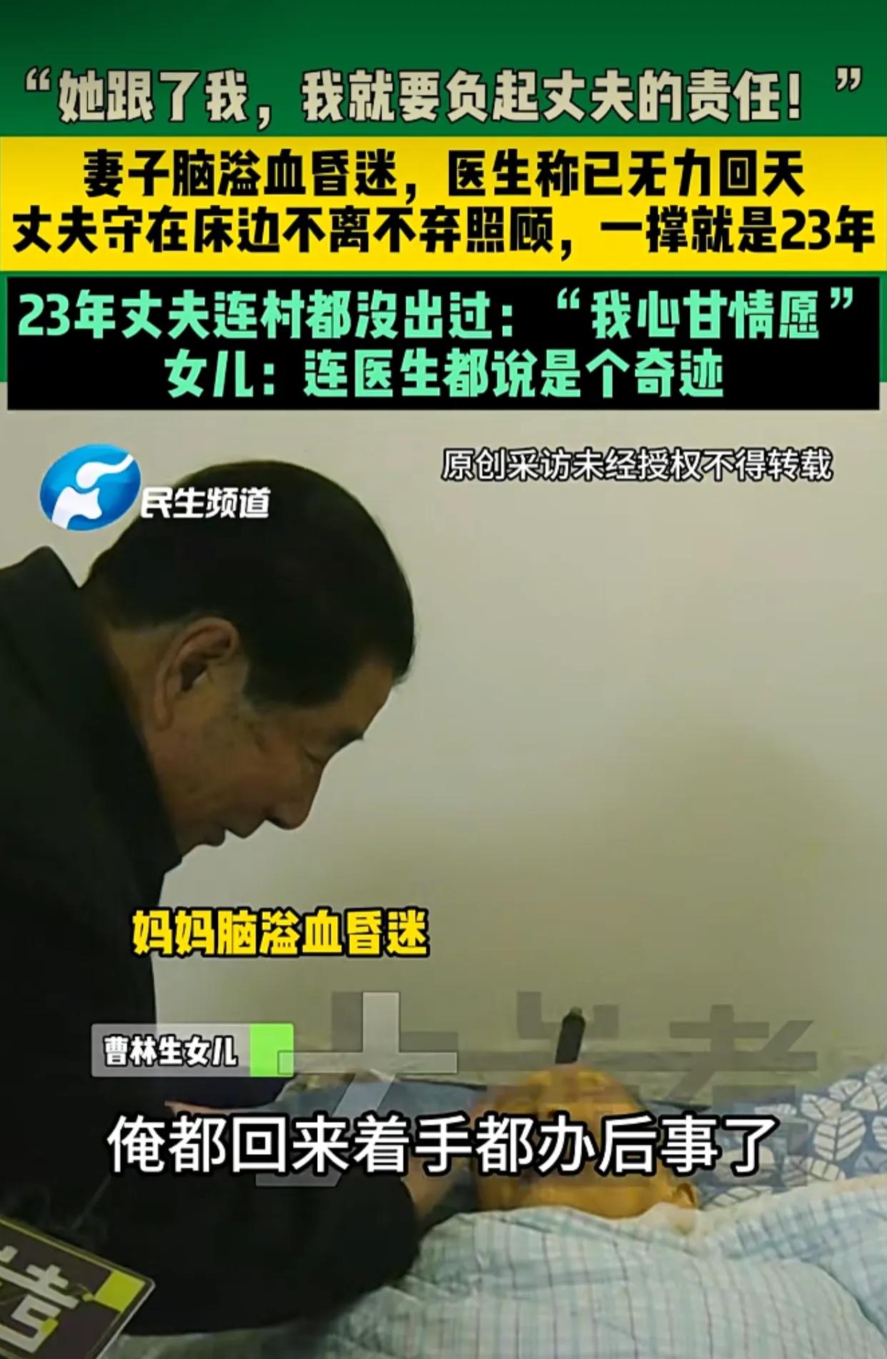 “她跟了我,我就要负起丈夫的责任!” 妻子脑溢血昏迷,医生称已无力回天,丈夫守在床边不离不弃照顾,一撑就是23年,23年丈夫连门都没出过:“我心甘情愿”!女儿:连医生都说是个奇迹! 这事就发生在郑州巩义回郭镇清东村,这男人叫曹林山,1999年大年初二,刚蒸好年馍的媳妇突然栽在案板前,送到医院时,医生捏着CT片子摇头:“脑干出血太严重,就算救回来也是植物人,没多大意思了。” 曹林山没松过媳妇的手。他本来是外村人,当年为了帮媳妇撑起没了兄长的家,直接落户到清东村,连岳父母的养老送终都包了。这会儿媳妇躺下,他把土炕铺得软和,每天天不亮先搓热手给媳妇按摩,怕长褥疮,俩小时翻一次身。最开始媳妇靠胃管吃饭,他得天天跑镇卫生院请医生换管子,大冬天雪没到脚踝,他裹件旧棉袄就往镇里赶,半年没断过一天。 村里人见他连赶集都只到村口老槐树,劝他“别熬垮自己”,他蹲在墙根抽烟:“她嫁给我时,我答应过要护着她的。”这一护,凳子都坐烂了仨——晚上最少起夜四五次,摸摸媳妇的呼吸,掖掖被角,有时候就坐在床边凳上打个盹。 2001年冬天媳妇又病危,医院下了三次通知书,曹林山攥着笔不肯签“放弃治疗”,末了把人接回家,用针管推米糊,拿棉签蘸水擦嘴唇。有回媳妇突然喘不上气,他抱着人往卫生院跑,雪地里摔得膝盖流血,爬起来接着走,到医院时手还在抖。 现在媳妇气色越来越好,连当年的主治医生来看了都愣:“躺二十多年还这么精神,真是少见。”曹林山倒没觉得是啥奇迹,只是每天给媳妇擦脸时,会念叨两句:“今天村头的槐花开了,等你好点咱去闻闻味儿。” 他不光是好丈夫,还是村里出了名的好女婿——岳父母晚年卧病,他一勺一勺喂饭擦身,把老人都照料到八九十岁。连邻居低保户都常说:“林山哥做了好吃的,准会给我端一碗。” 现在年轻人总说“爱要浪漫”,可曹林山的日子,是把“浪漫”揉进了23年的米汤里。他没说过“我爱你”,却把“我陪着你”做了一辈子。 各位读者你们怎么看?欢迎在评论区讨论。
