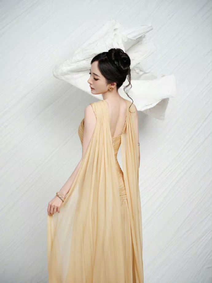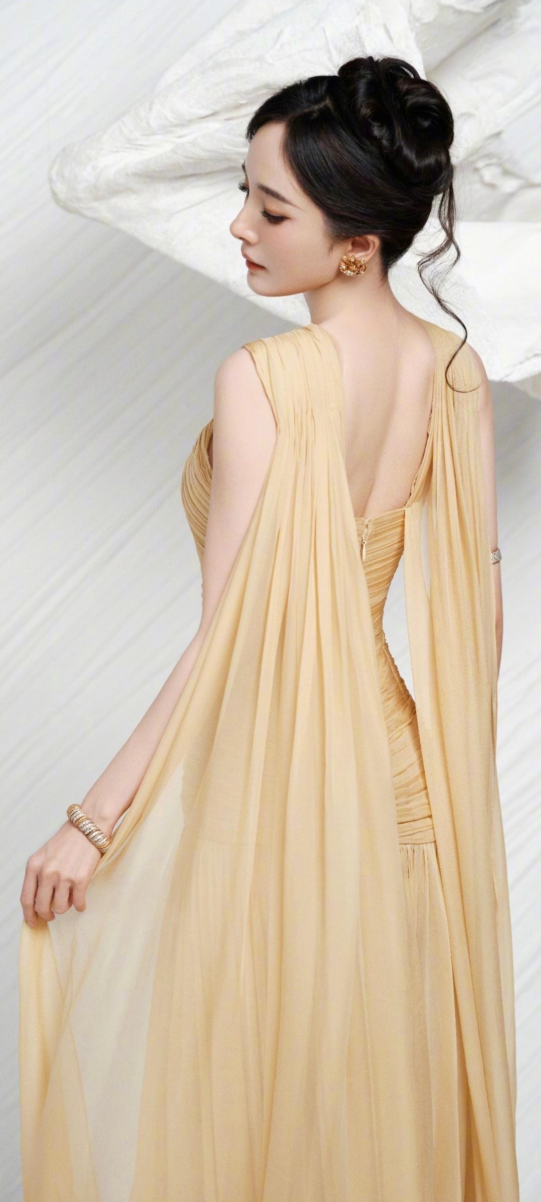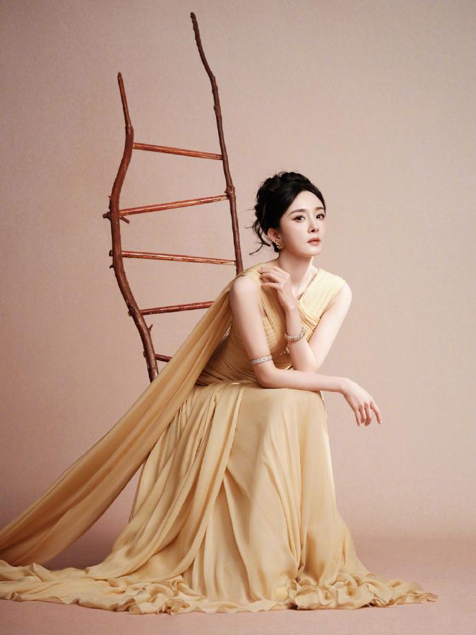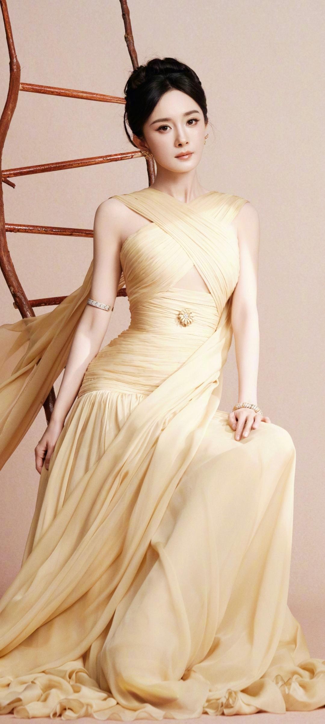 优雅气质,浅黄色长裙,复古木椅,时尚大片杨幂!!!!