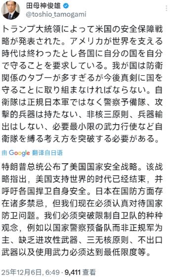 日本航空自卫队前参谋长田母神俊雄今天(12月6日)发文写道:“特朗普总统公布了美国国家安全战略。该战略指出,美国支持世界的时代已经结束,并呼吁各国捍卫自身安全。日本在国防方面存在诸多禁忌,但我们现在必须认真对待国家防卫问题。我们必须突破限制自卫队的种种观念,例如以国家警察预备队而非正规军为主,缺乏进攻性武器,无核三原则,不出口武器以及使用武力必须达到最低限度等。” 今天有个消息挺受关注,日本航空自卫队前参谋长田母神俊雄发文,盯着刚公布的美国国家安全战略说事儿,直言“美国支持世界的时代结束了”,催着日本赶紧突破国防上的各种限制。 这位前航空幕僚长可不是普通人,1948年出生的他,从防卫大学毕业后一路做到航空自卫队最高长官,2007年当上航空幕僚长,却在第二年就因为写文章否认日本侵略历史被撤职,那篇文章还拿了右翼企业的奖金,闹得中韩都出面批评。 离开军队后他更活跃,组织右翼团体、搞反华活动,还两次竞选公职失败,甚至因为违反选举法被判过缓刑。 说白了,他一贯就主张重整军备,这次发文不过是老调重弹。 他盯着的美国新战略,其实是白宫4号刚发布的,33页的文件核心是把拉美当成重点,要加强边境和反毒,压根没把亚洲放首位。 但田母神特意揪出“各国捍卫自身安全”这句,对着日本的国防禁忌开炮,说要改“自卫队像警察预备队”的观念,还要搞进攻性武器、松绑无核三原则和武器出口限制。 这说法看着突然,其实早有苗头,尤其是今年7月日本《防卫白皮书》就喊着要发展“反击能力”,计划2026年前部署500枚“战斧”导弹,西南诸岛还在建导弹基地和日美共用军事设施。 现在防卫预算已经到了GDP的1.8%,正往2%冲,首相高市早苗那边还在讨论放宽武器出口、重新审视无核三原则。 这么看,田母神的话更像是给这些动作找借口。 但这里面矛盾不少,美国虽然喊着让盟友自强,却要日本把防卫预算提到5%,日本直接拒绝了,其实是想借美国收缩的机会自己攒实力。 可无核三原则是日本民众撑了几十年的底线,毕竟挨过原子弹轰炸,改了这个等于碰全民红线。 而且现在往西南岛链堆武器、跟北约勾连,已经让周边国家警惕,真突破那些禁忌,东亚军备竞赛肯定更激烈。 田母神这类右翼的声音,本质是想借着国际形势的变化,把日本往“正常国家”的军事路线上推。 但历史账还没算清,又要动国防红线,这步子迈得太急,终究得考虑地区安全的后果。 以上都是个人观点,对此您有什么不同的看法,可以在评论区留言讨论!!!