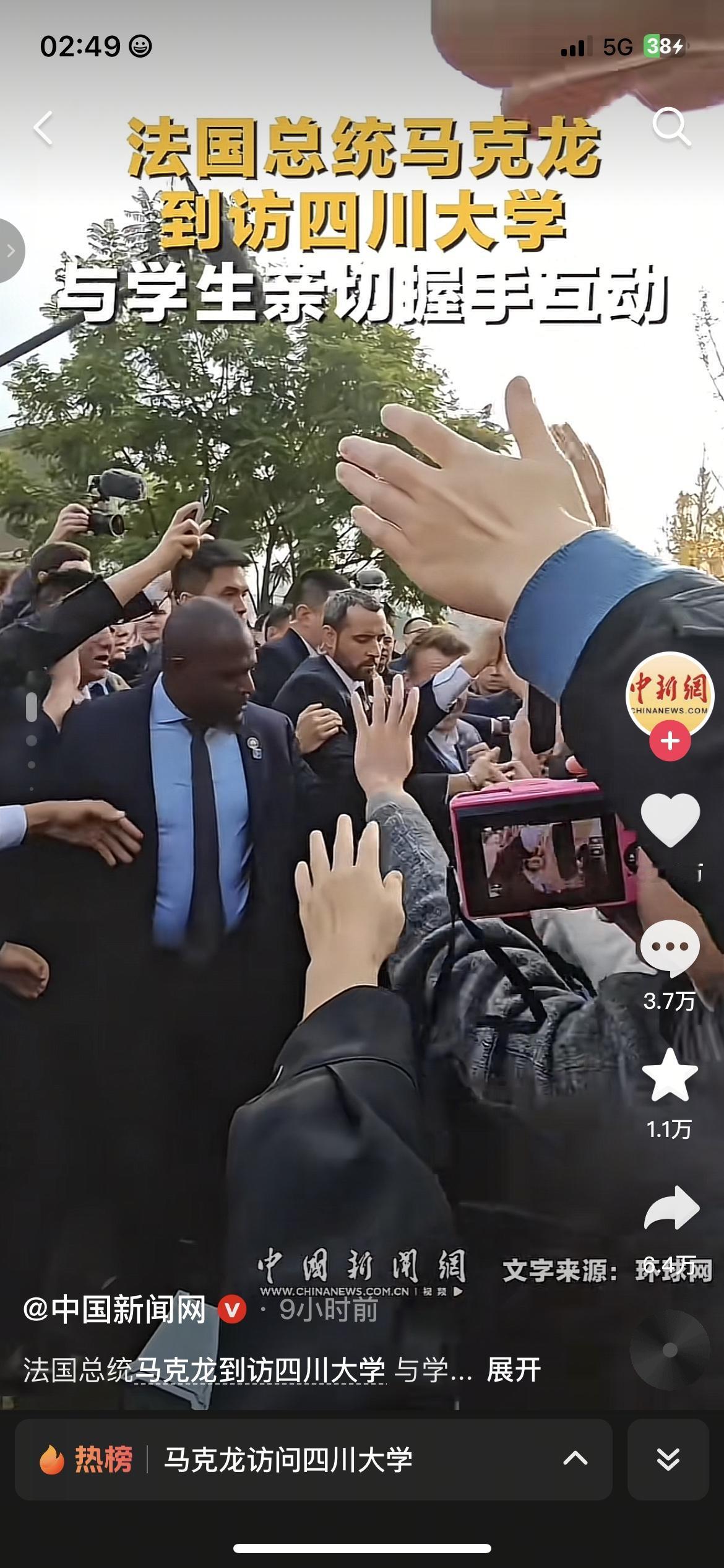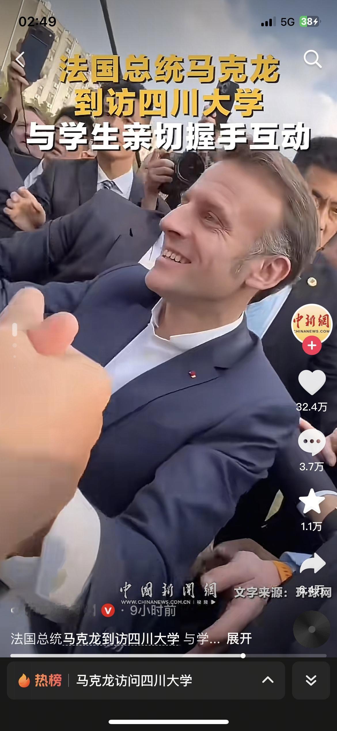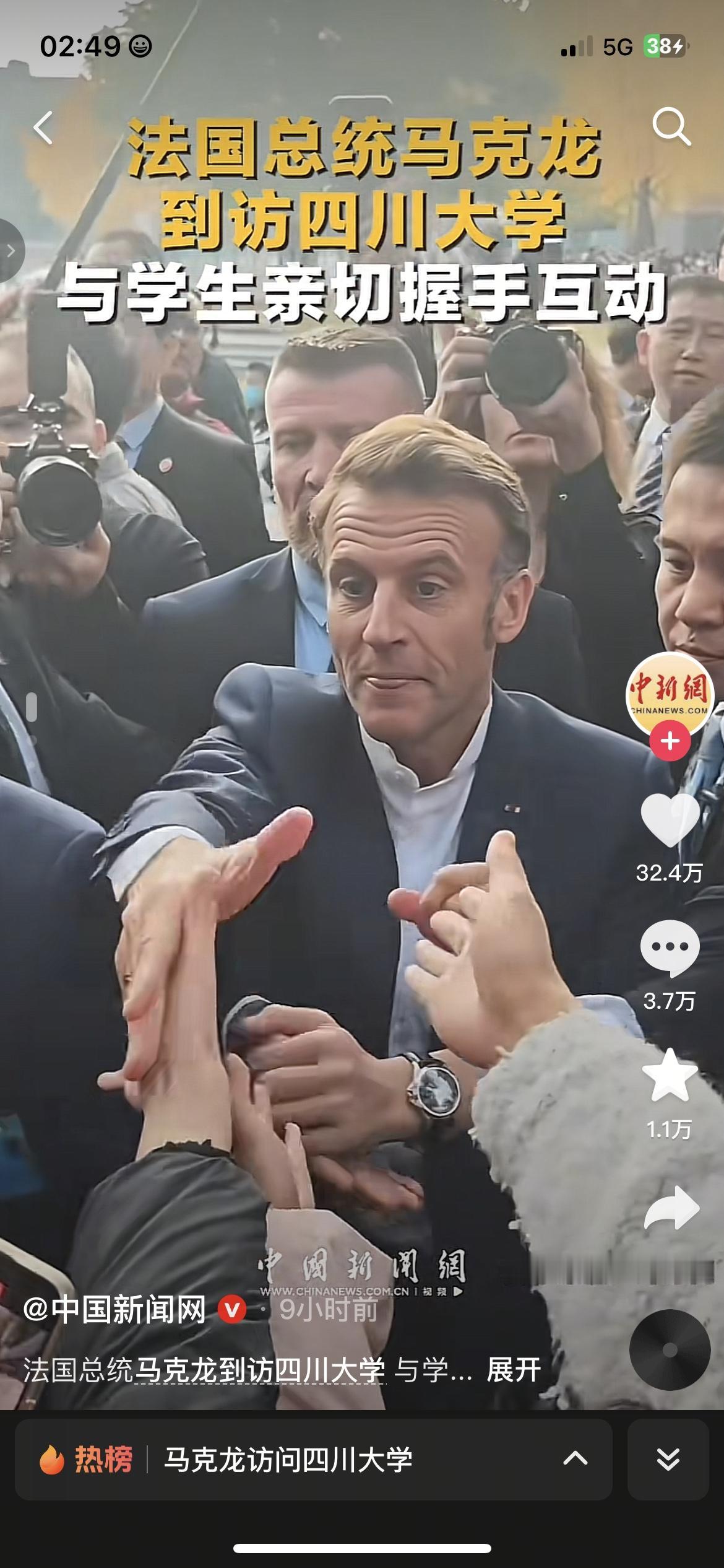 现场超热闹!马克龙到访川大,被学生围堵握手互动超亲切 马克龙访华行程中专程走进四川大学,刚到校园就被学生们热情围拢,全程微笑挨个握手回应,现场拍照欢呼声不断,氛围格外融洽。 这场近距离互动把中法人文交流的暖意拉满,不少网友调侃:“能和总统握手,川大学生这波体验太珍贵了!”