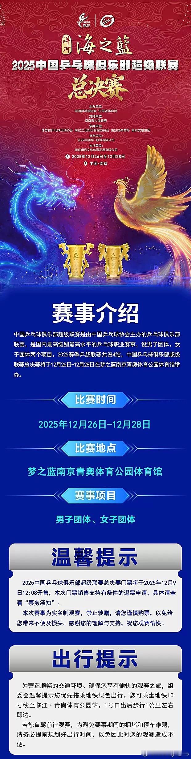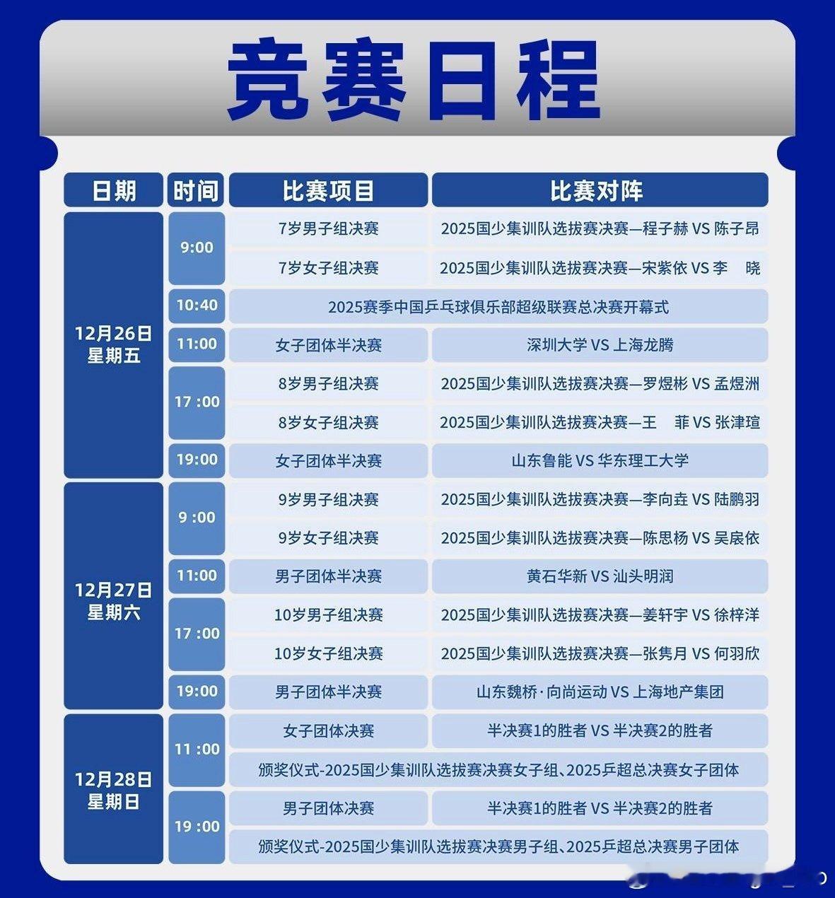 2025赛季中国乒乓球俱乐部超级联赛总决赛2025.12.26-12.28 ¥58-988南京市•梦之蓝青奥体育公园体育馆竞赛日程12月26日(星期五)• 10:40:2025赛季中国乒乓球俱乐部超级联赛总决赛开幕式• 11:00:女子团体半决赛:深圳大学 🆚 上海龙腾• 19:00:女子团体半决赛:山东鲁能 🆚 华东理工大学12月27日(星期六)• 11:00:男子团体半决赛:黄石新华 🆚 汕头明润• 19:00:男子团体半决赛:山东魏桥·向尚运动 🆚 上海地产集团12月28日(星期日)• 11:00◦ 女子团体决赛:半决赛1的胜者 🆚 半决赛2的胜者◦ 颁奖仪式:2025乒超总决赛女子团体• 19:00◦ 男子团体决赛:半决赛1的胜者 🆚 半决赛2的胜者◦ 颁奖仪式:2025乒超总决赛男子团体
