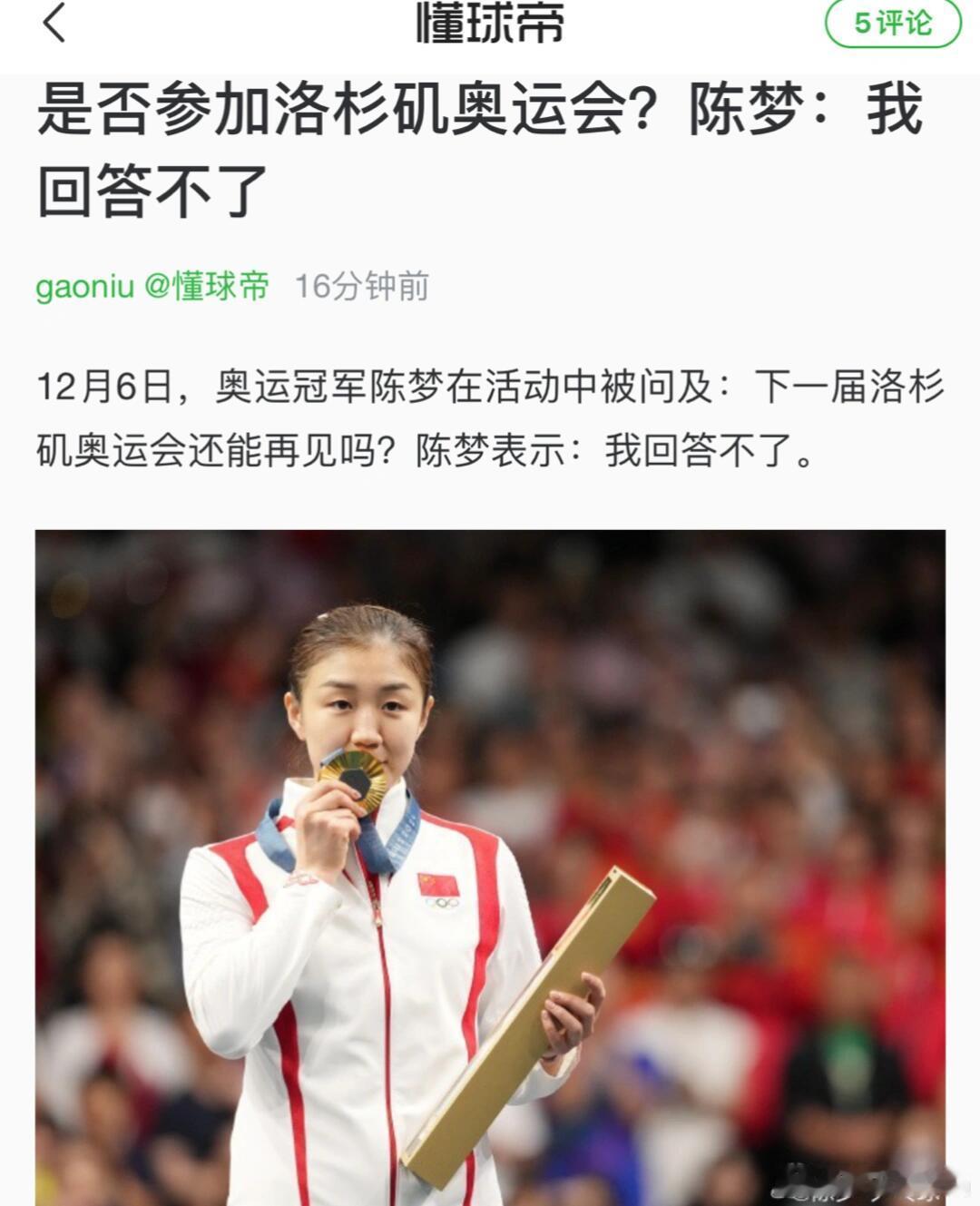 巴黎奥运会决赛之后,陈梦已经没有机会了||12月6日,陈梦在活动中被问到能否参加下届洛杉矶奥运会时坦言:“我回答不了。”她表示自己早已过了运动员黄金年龄,东京奥运会27岁夺冠时已是女乒年龄最大选手,巴黎奥运会30多岁再夺金牌,是在不断突破自身极限、创造不可能。心中有梦,但未来能否实现,并非她能直接回答的。
