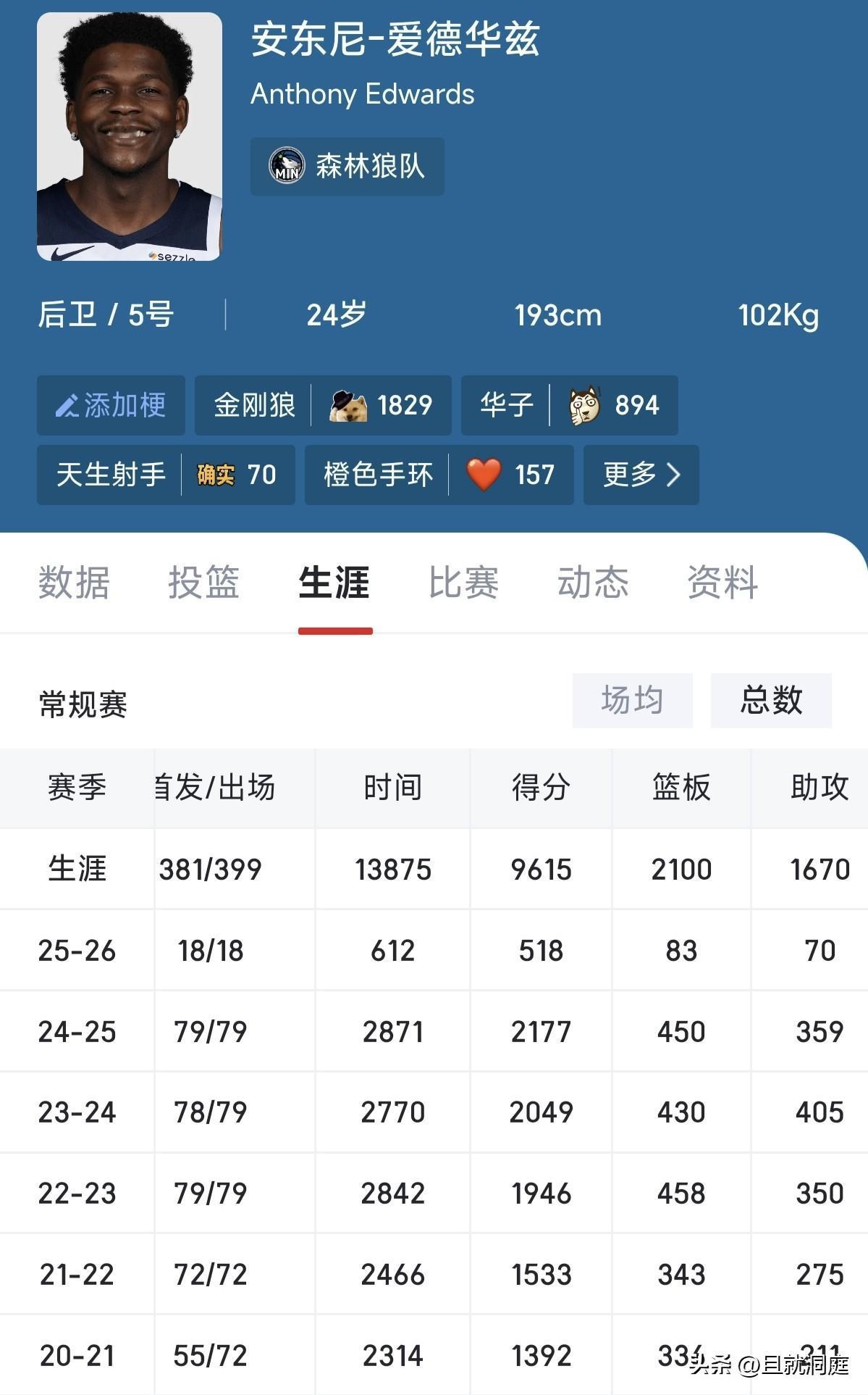 现役最有机会接近詹姆斯总得分的球员不是杜兰特和字母哥,也不是东契奇,而是更年轻的爱德华兹,目前他已经拿到9615分,在不久的将来突破万分,这是他第6个赛季,如果本赛季结束总得分突破11000分大关,也意味着平均每个赛季场均接近2000分,也是最接近詹姆斯的球员。如果未来十个赛季没有伤病,也许会有好的结果。