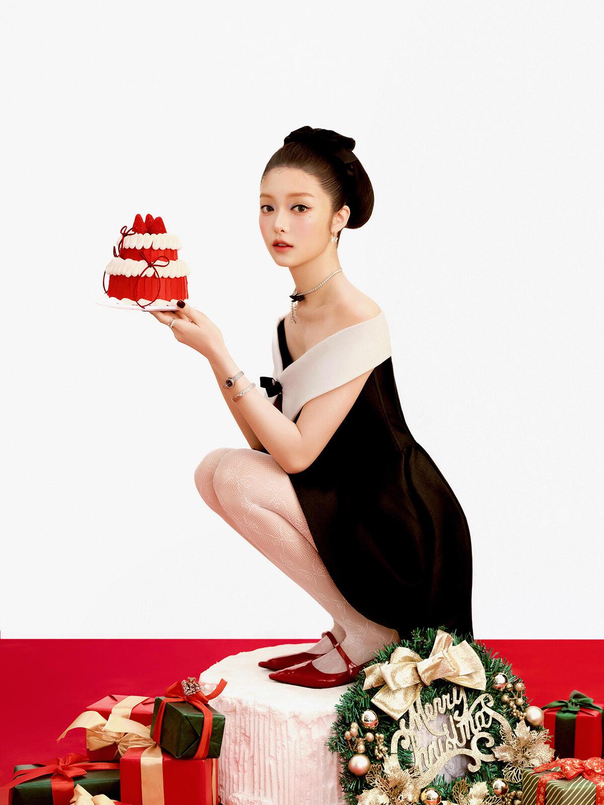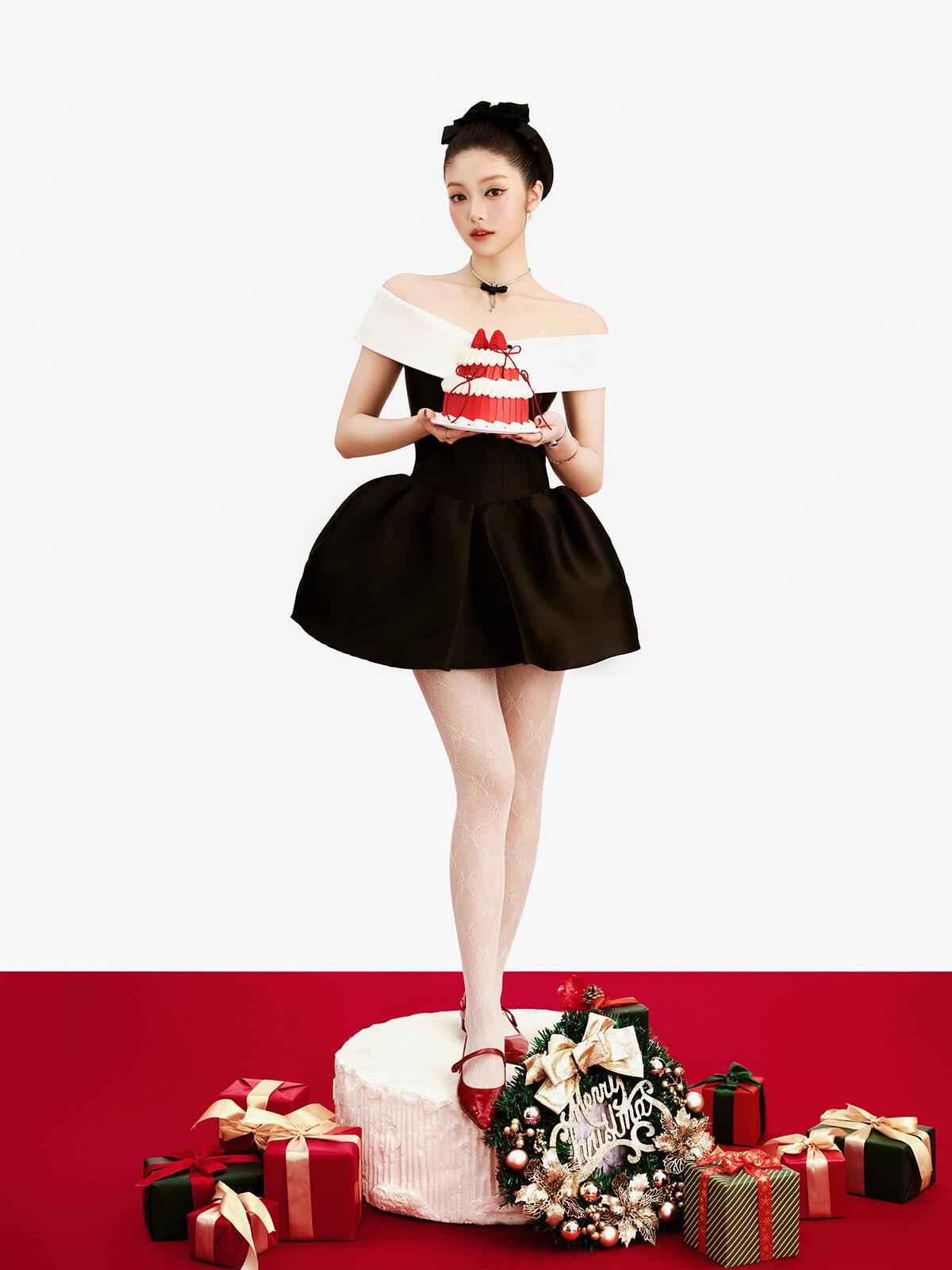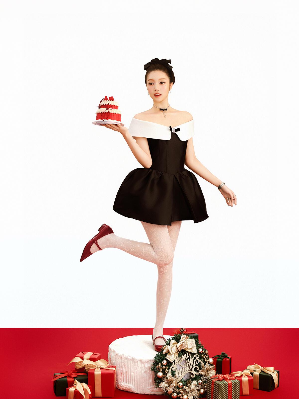 她从黑白交界处走来,肩头落着雪,眸底映着火。黑裙如夜,白边似月,蝴蝶结是未说出口的温柔絮语。 - 礼物盒里藏着时光的密语,圣诞树下的光影是岁月的温柔呢喃。 - 她以优雅的姿态立于红白之间,既是奥黛丽·赫本的复古倩影,亦是当代时尚的摩登图腾。每一帧皆成诗,每一步皆为画。 -