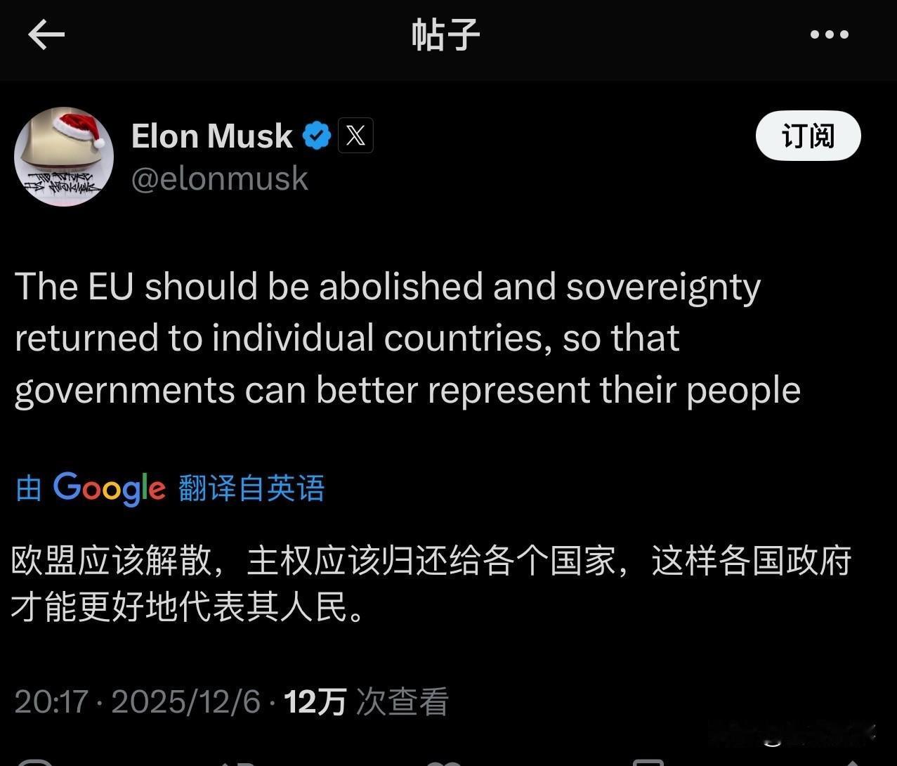非常生气!马斯克表态! 就在今天,美国社交软件X的原执行总裁马斯克发文表示,“欧盟应该解散,主权应该归还给各个国家,这样各国政府才能更好地代表其人民。” 这么生气!看来马斯克老板是收到了来自欧盟的罚单了,那可是一笔不小的数字……