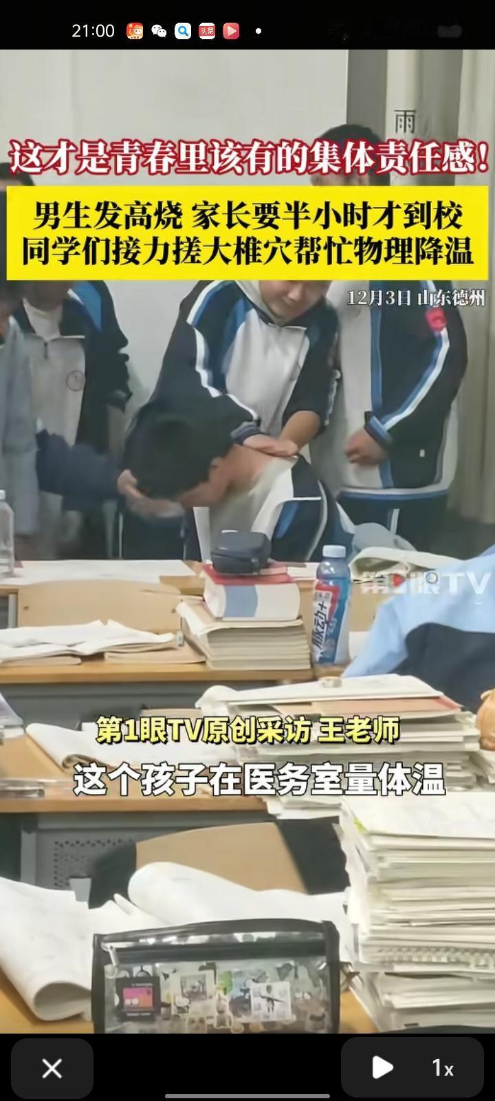 12月4日,山东德州。男生发烧到39.5度,老师打电话联系其家长被告知要半小时才到校,想到平时看一些中医科普的视频,用过搓太阳穴,就让学生们帮忙给他搓,几分钟后男生就出汗了,大家就放下心来。