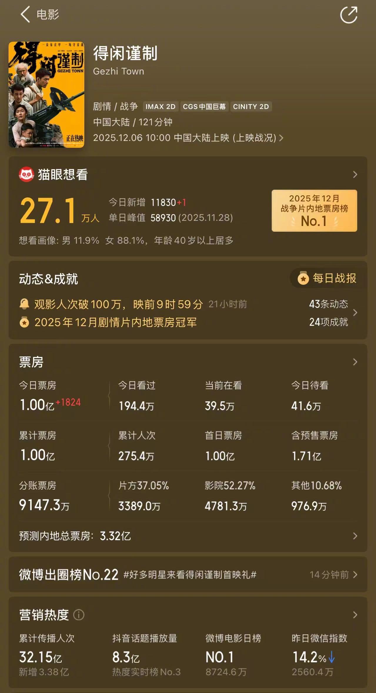 电影得闲谨制首日票房破亿 据猫眼专业版数据,电影《得闲谨制》上映首日,单日票房破亿!