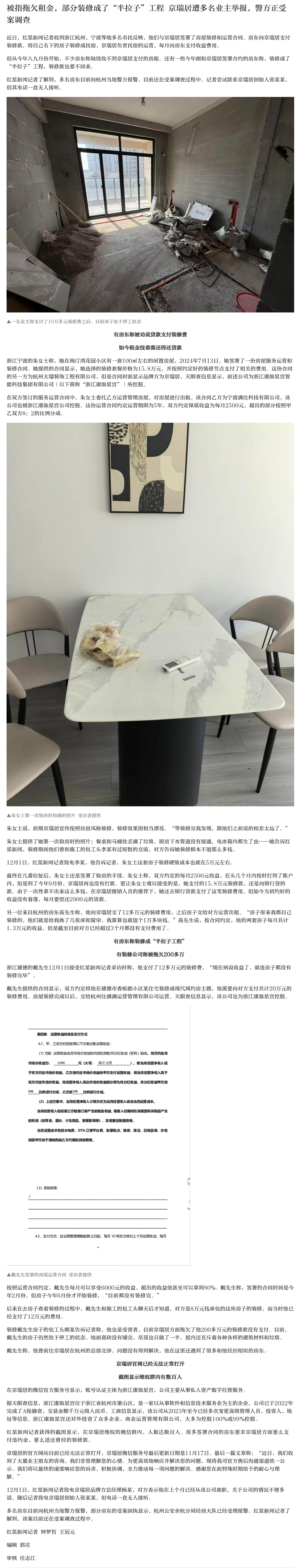 【#京瑞居遭多业主举报拖欠租金#】#房东回应被京瑞居拖欠租金# 近日,红星新闻记者收到浙江杭州、宁波等地多名市民反映,他们与京瑞居签署了房屋装修和运营合同。房东向京瑞居支付装修款,将自己名下的房子装修成民宿,京瑞居负责民宿的运营,每月向房东支付收益费用。但从今年八九月份开始,不少房东称陆续收不到京瑞居支付的房租。还有一些今年刚和京瑞居签署合约的房东称,装修成了“半拉子”工程,装修款也要不回来。红星新闻记者了解到,多名房东目前向杭州当地警方报警,目前还在受案调查过程中。记者尝试联系京瑞居创始人张某某,但其电话一直无人接听。在京瑞居的微信官方服务号显示,账号认证主体为浙江康旅星宫,公司主要从事私人资产数字托管服务。据天眼查信息,浙江康旅星宫位于浙江省杭州市萧山区,是一家以从事软件和信息技术服务业为主的企业,公司已于2022年完成了A轮融资,交易金额千万元级人民币。工商信息显示,该公司从2023年至今已经多次变更高级管理人员、投资人、地址等信息。浙江康旅星宫还对外投资了众多企业、商业运营管理有限公司,大多为控股100%或99%控股。红星新闻记者获得的截图显示,在京瑞居维权的微信群内,人数达数百人。很多签署合同的房东要求京瑞居方面要么支付违约金,要么退还曾经的装修款。京瑞居的官方网站目前已经无法正常打开,京瑞居微信服务号最后更新日期是11月17日。最后一篇文章称:“近日,我们收到了大量业主朋友的咨询,我们非常理解您的心情。为更高效地响应并解决您的问题,现将我司官方售后沟通渠道统一公示。我们将以最快的速度响应您的诉求,积极协调,全力推动每一项问题的解决。感谢您在此特殊时期给予的耐心与理解。”12月1日,红星新闻记者致电京瑞居品牌方总经理杨某,对方表示他在上个月已经从该公司离职,关于公司的情况不便多说。随后记者致电京瑞居创始人张某某,但电话一直无人接听。多名房东目前向杭州当地警方报警,部分房东的受案回执显示,杭州公安余杭分局经侦大队已经受理报警。红星新闻记者了解到,该案目前还在受案调查过程中。网页链接