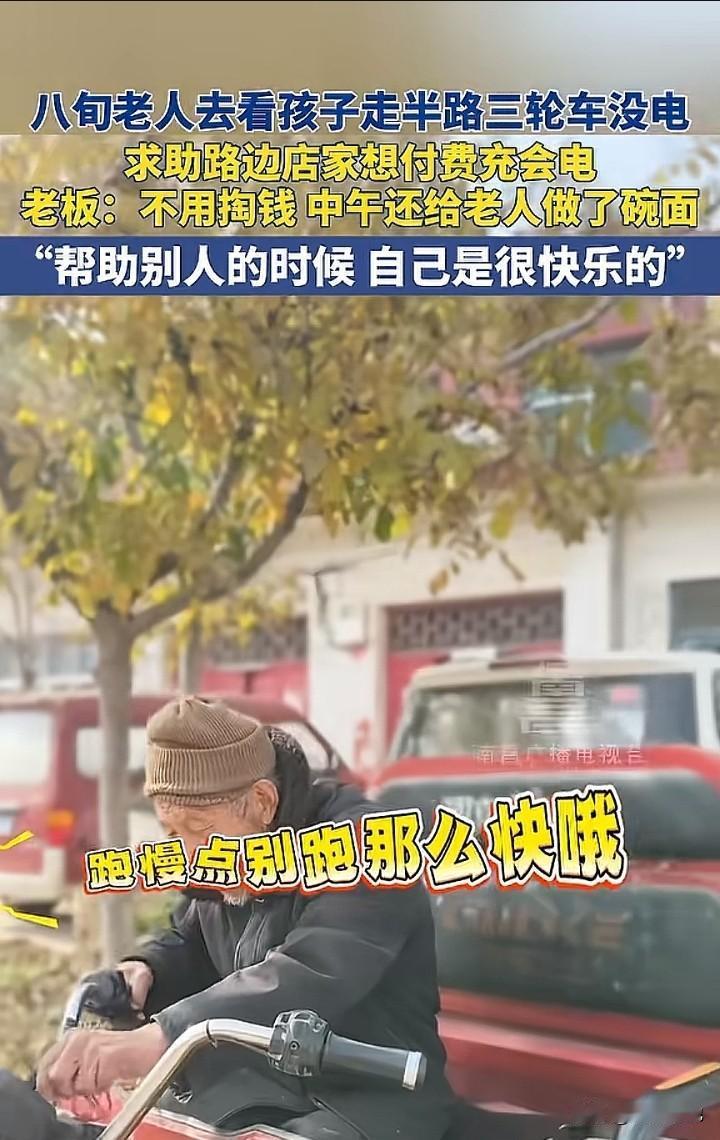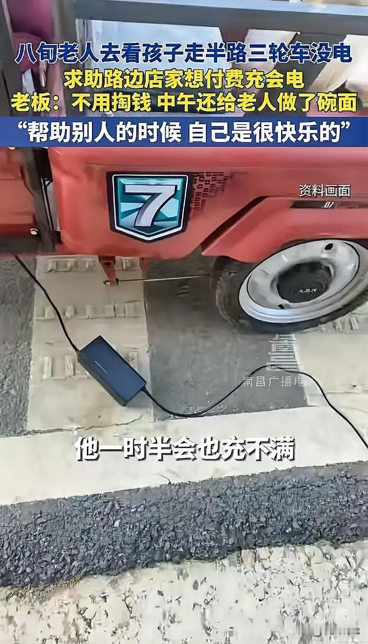 河南南阳,一80岁老人骑着自己的电动三轮去看孙子,结果,刚骑没多久车就没电,无奈之下,便攻到路边的一家店充会儿电,没想到,店内大姐知道老人情况后,不仅免费给老人冲满了电,还让大爷在这免费在这吃了一碗饭。 大姐在店内开门做生意,突然一位80岁左右的老人走了进来,说道:“妮,我电动三轮没电了,你能让我在这充会电吗,我想去看孙子,可没走一会就电了!” 大姐一看老人焦急的模样,一口便应了下来,她也知道,老人出一趟门不容易,当大爷从口袋掏出钱递给她,没想到,大姐接下来的举动老人心头一暖。 大姐干脆的说道:“大爷,就你在这放心的充吧,我不收你的钱,保证让你见你孙子!” 老人也是被大姐逗的开心的笑了下来,看到大爷去的地方有点远,这车一时半会也充不满电,恰巧又到了中午的饭点。 大姐又在屋里忙活着做饭,顺带着帮老人也做一碗,当她把做好的面条端到老人面前时,老人还有点不好意思。 这一分钱没花,在这又是蹭电又是蹭饭。大爷笑着说道:“妮,真是麻烦你了!” 大姐一听,也是开心的合不拢嘴,笑着说:“就咱俩,一点也不麻烦!” 过了有一段时间,大爷电车的电也充满了,面条也吃好了,高兴的上路。 大姐也不忘提醒:“开车的路上可得慢点啊。” 大爷连连点头,脸上带着笑容,缓缓离开了。 大姐把这一幕发到网上,到处都是对大姐的赞美之声! 有人说:“善良的人必发财,这老板真中!” 也有的说:“人美心善,积福下代。” 大姐的一个善举,不仅温暖了老人的内心,让老人如愿以偿的见到自己的孙子,自己也快乐了一整天。 她的行动像一束光,照亮了我们每个人的内心。 向这位平凡的大姐点赞!