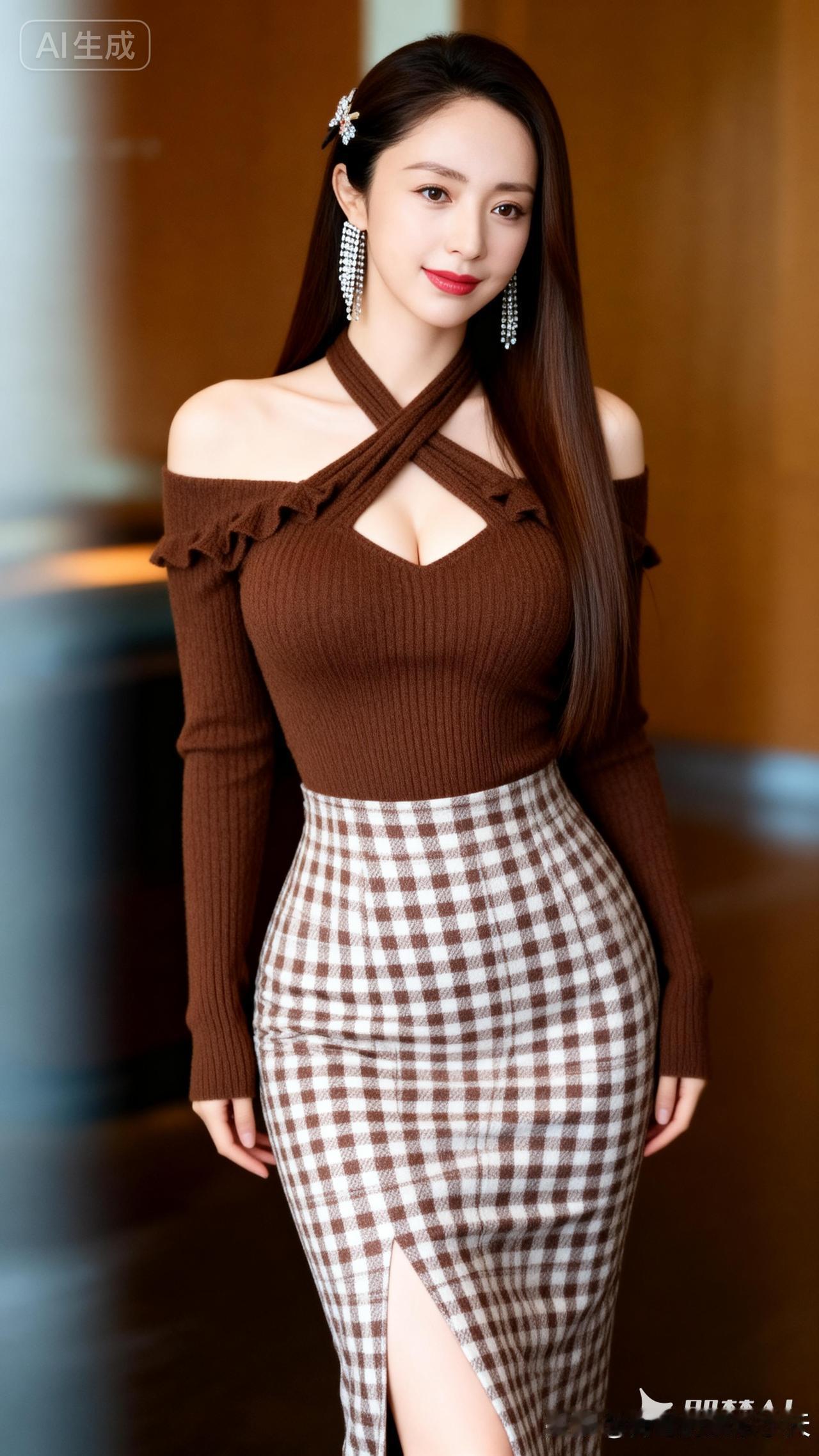 优雅气质穿搭,棕色毛衣搭配格子裙,尽显时尚魅力!