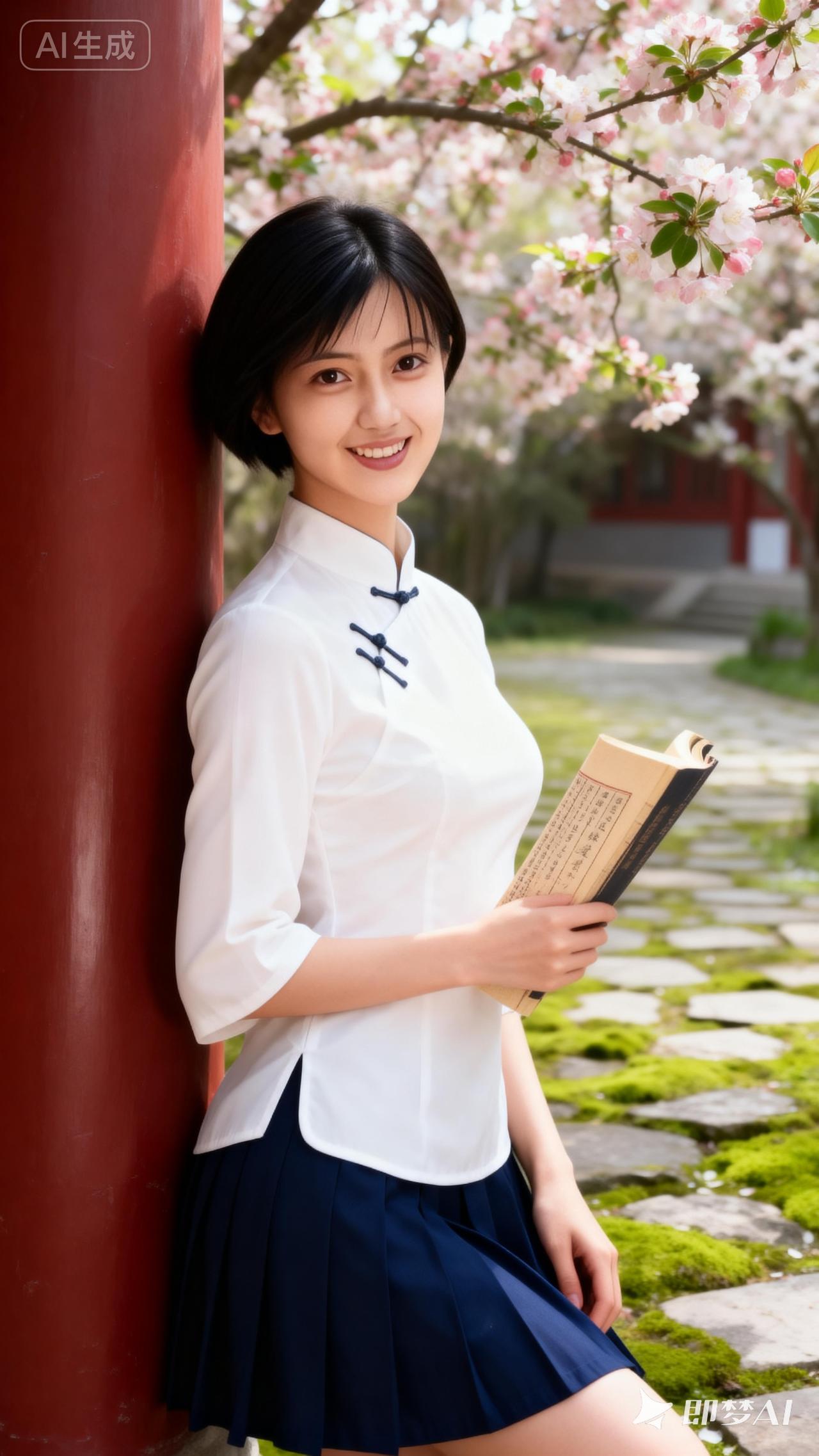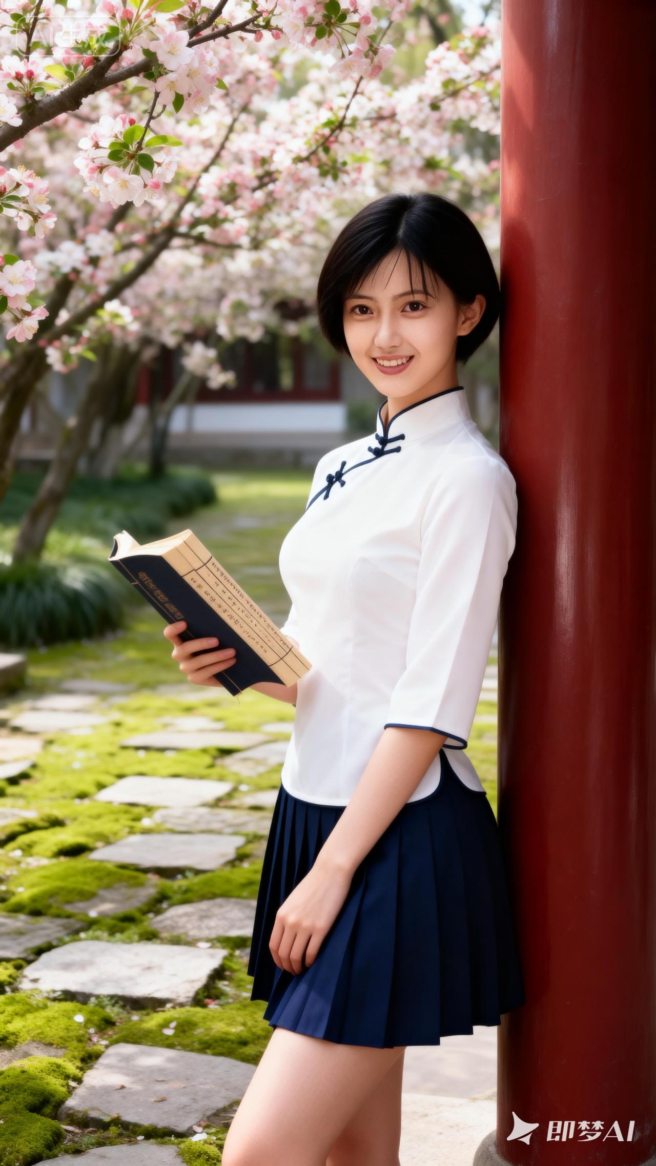 樱花树下,少女轻倚红柱,手持古书,悠然自得。