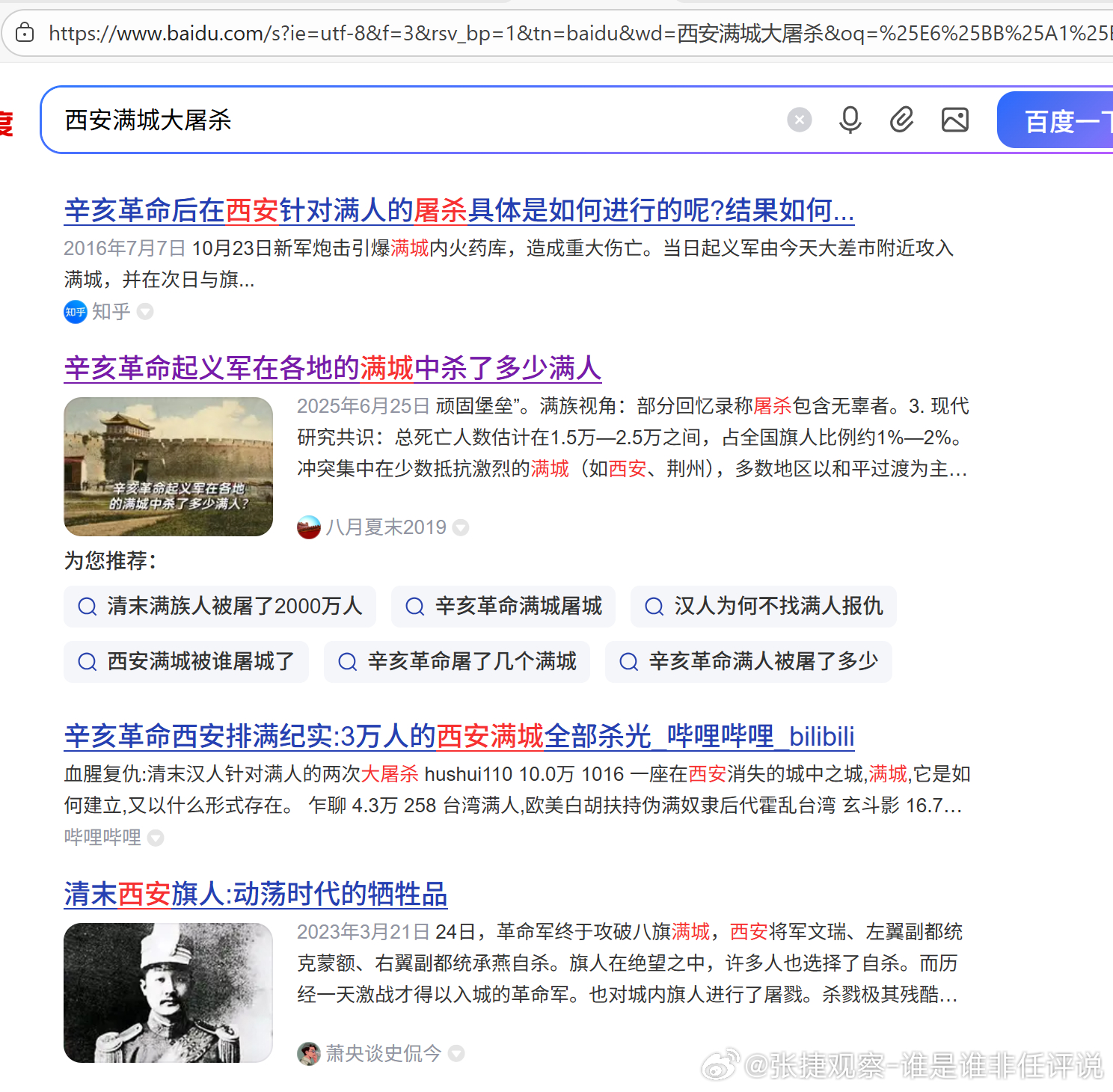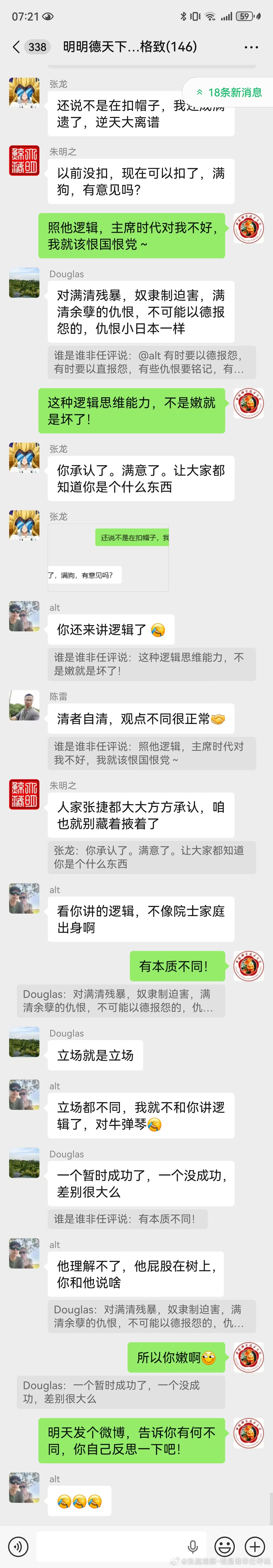 #张捷盘历史# 为了吃瓜有人讲“满清与日本的仇恨是一回事,差别就是满清成功了”。但这里是有根本区别的。以德报怨还是以直报怨?是世仇应当铭记还是一笑泯恩仇?这里也是有标准的。在仇恨问题上,对日对满就是不同的。对满清当年是民族和解,清帝逊位,中华是五族共和,清朝是正统王朝,满人也认了炎黄子孙。如果日本人也认定它们是中华后裔,也认定融入中华,日本的土地也并入中国,那样才是与满清的仇恨对等的。满清当初是有选择的,它是可以分裂中华引入列强的,当年的革命汉人对满城也是屠城的!但它选择了逊位和五族共和,民族和解重塑,保持了中华的完整没有分裂,没有引狼入室,让列强进来“平叛”。五族共和以后中华是华人对外不分满汉。日本当年是支持汉人革命同时,希望满人给它更多的利益,分裂中华,同时列强都想要肢解中华!所以满清在最后时刻有底线,保持中华的完整,满清也是有历史贡献的。已经双方和解了,之后再谈仇恨要报仇,就是要破坏民族团结了。因此现在再煽动极端满汉民族仇恨的,不是小嫩黄就是高级黑,汉人是HJ,满人是满毒!内部矛盾以德报怨,外部则不同。就如兄弟之间,你去铭记仇恨吗?以后再满汉通婚都是华人,过了百年你如何清算历史论仇恨?!搞极端主义还要辩解针对满清不是满族,它们的实际做法和效果如何?