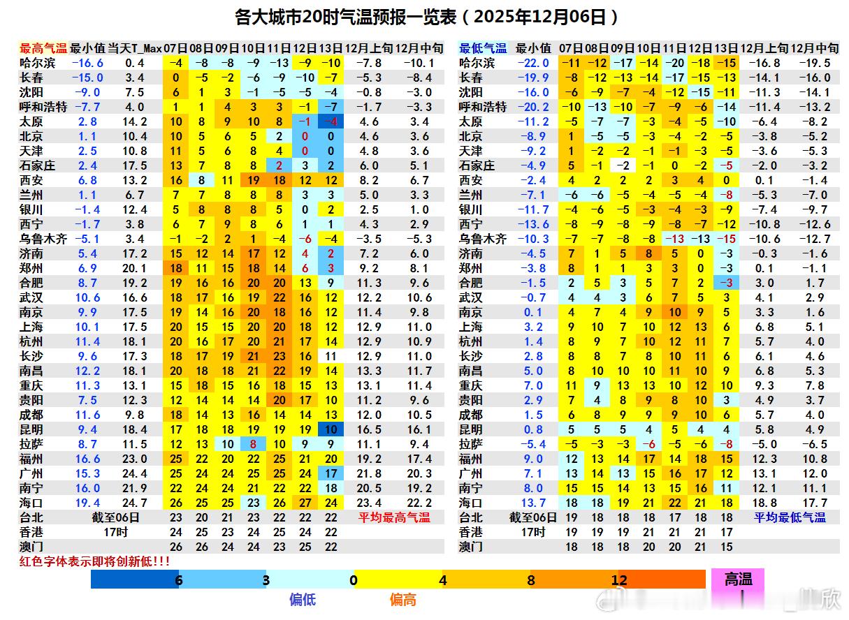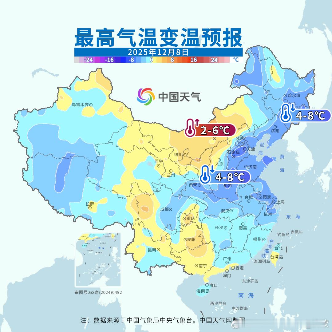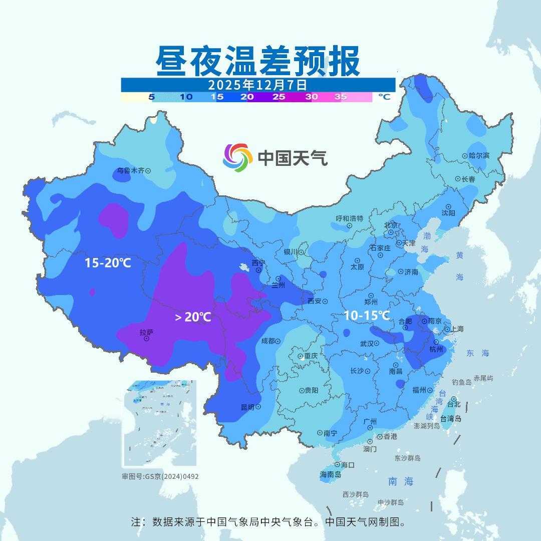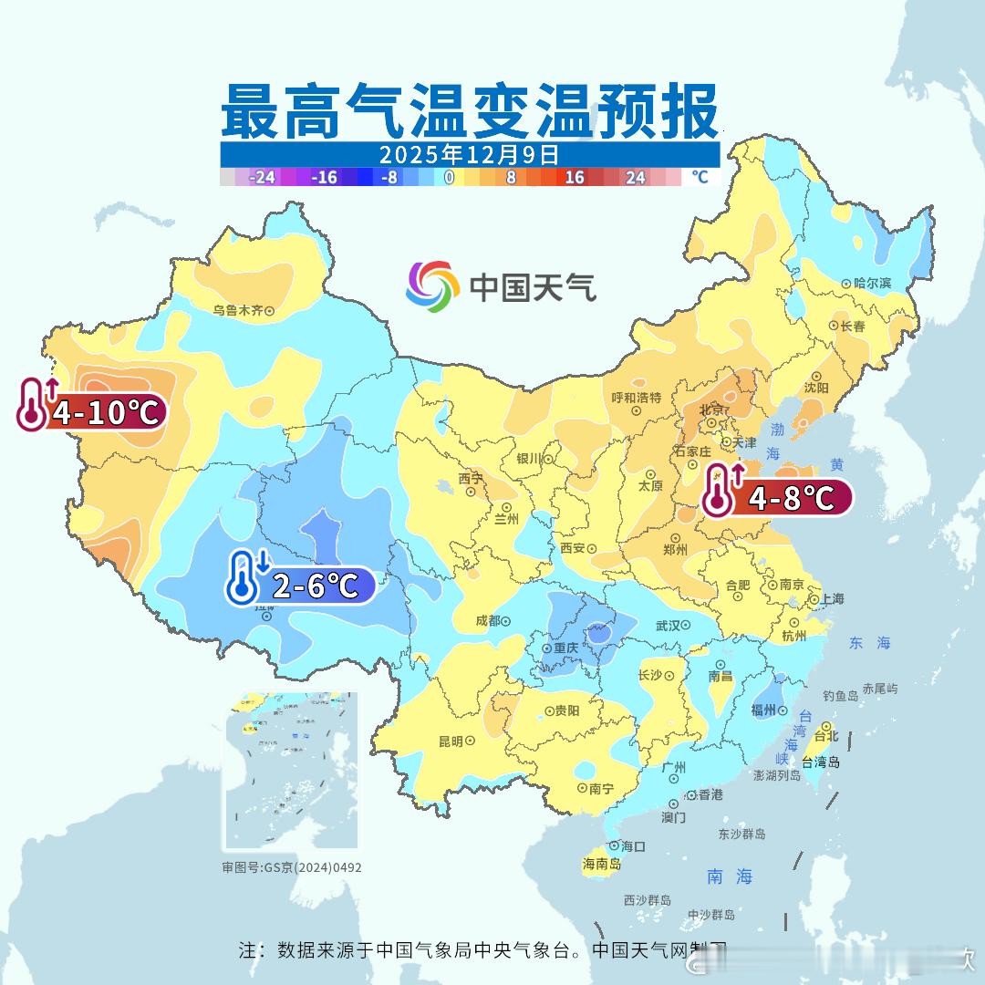 【气温波动加大】未来2天将有冷空气东移南下,导致中东部出现4-8℃降温。把近期过于偏高的气温,拉回来一些。随后气温还会上升,10-11日中东部多地气温又会大幅偏高,长江中下游多地气温偏高幅度可达8-12℃。但10日以后冷空气增强,我国多地将出现剧烈降温。10-13日期间,最高气温降幅可能超10℃的有:济南降15℃(17-2),郑州降15℃(18-3℃)、太原降14℃(10-零下4)、长沙降12℃(23-11)、合肥降11℃(20-9)。此外未来3天昼夜温差也较大,一天中也如同两个季节,比如明天南京4-19℃,一天温差15℃。