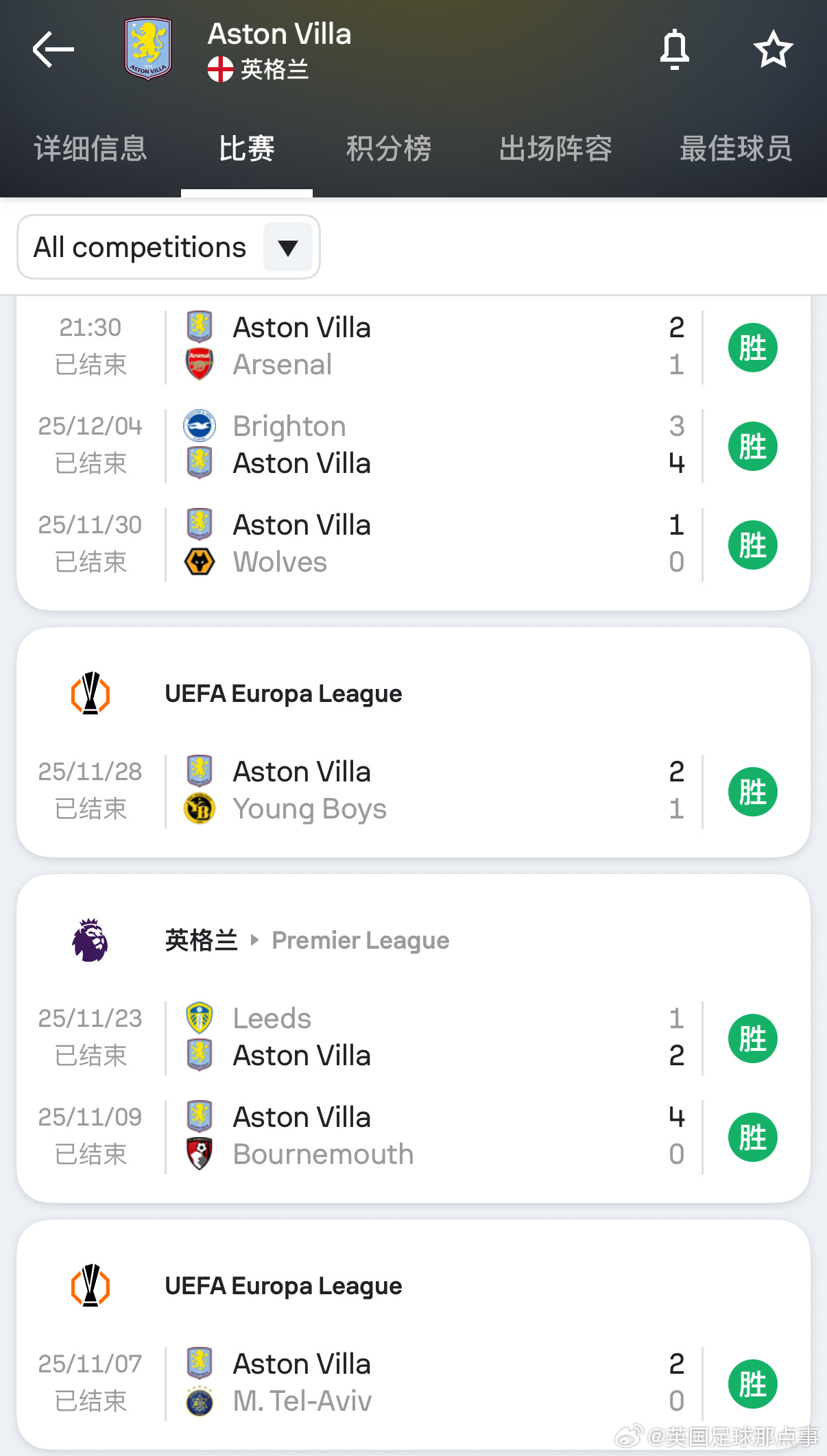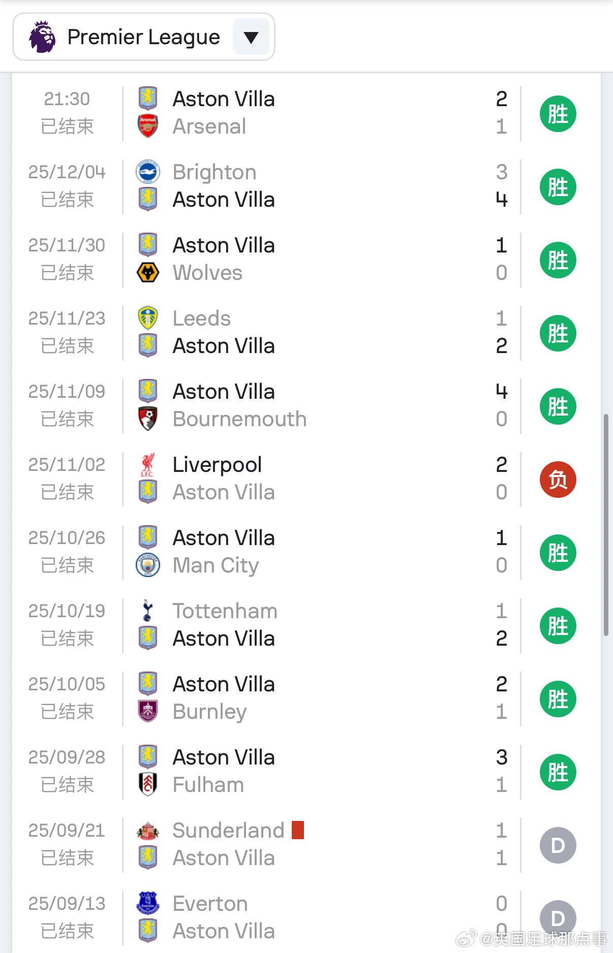 这样的状态谁来都不好使维拉近期各项赛事豪取7连胜!在顶级联赛近10场赢下9场,上一次打出这个数据还是106年前(1919年)!阿斯顿维拉2比1阿森纳