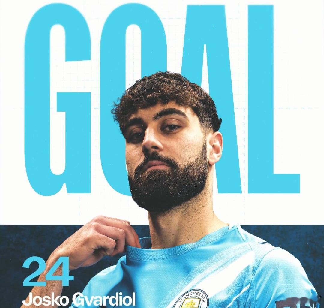 格瓦迪奥尔在35分钟头球破门,曼城2比0领先桑德兰,这是格瓦迪奥尔本赛季的第二粒联赛进球