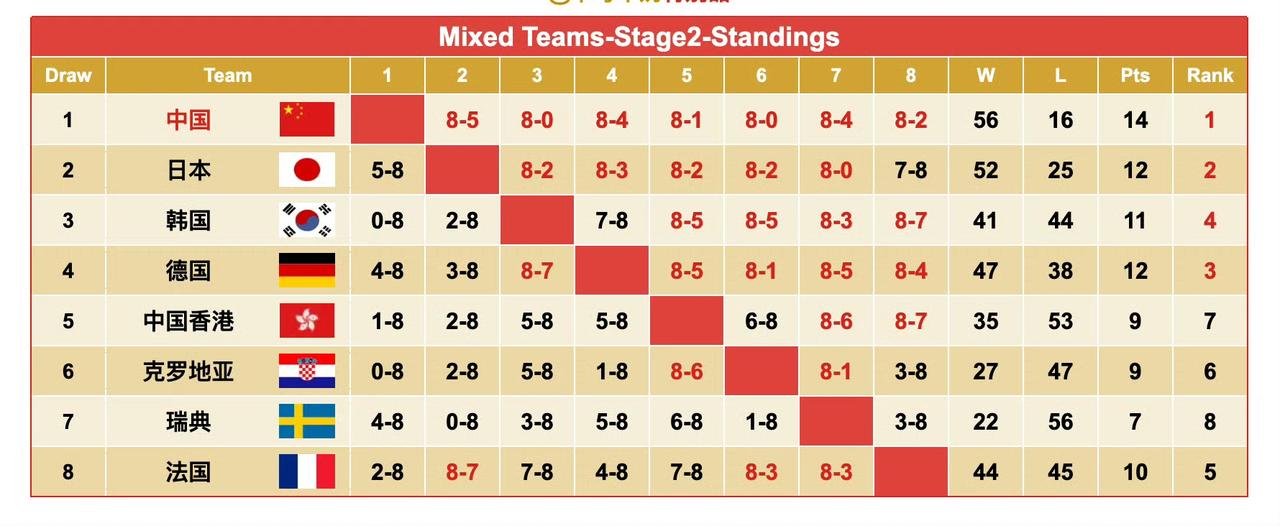 依次排在前四位的中国队🇨🇳、日本队🇯🇵、德国队🇩🇪、韩国队🇰🇷晋级第三阶段比赛! 2025成都国际乒联混团世界杯第二阶段循环赛比赛结果如下图。 法国队有点遗憾了,两场都是7-8,法国队真是被自己的女队祸害了[捂脸]。 这样一来,排名第一位的中国队将和排在第四位的韩国队进行半决赛,排在第二位的日本队将和德国队进行另一场半决赛。 我估计邱党🇩🇪已经在摩拳擦掌了[捂脸]。 (感谢草莓老师的图片)