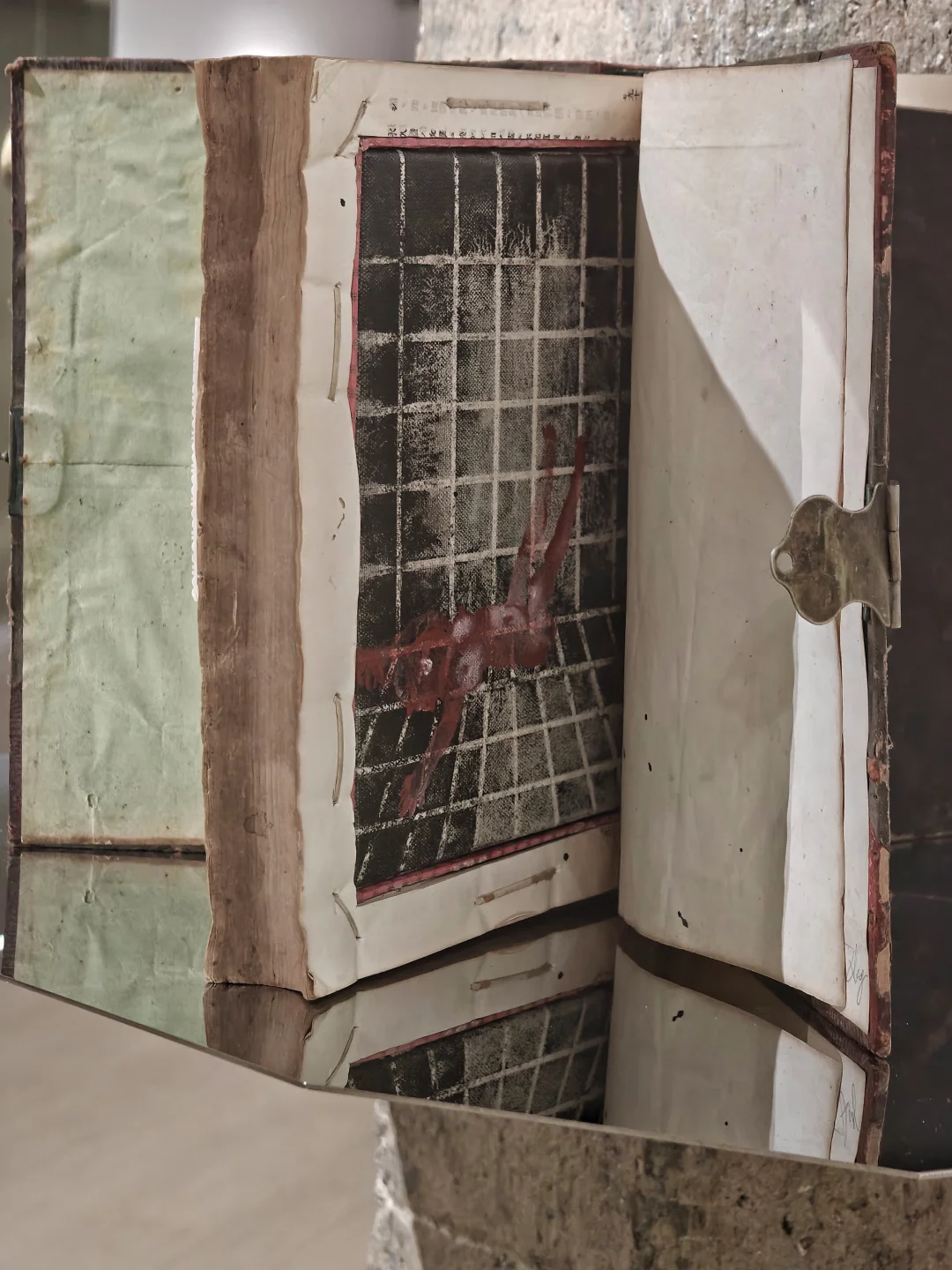 基于童年溺水记忆,将家族谱系与个人经历并置,通过古董书集物箱的形式,象征个体身份与集体宿命的微妙联系,探索“母体象征”与“社会化容器”的自我重构