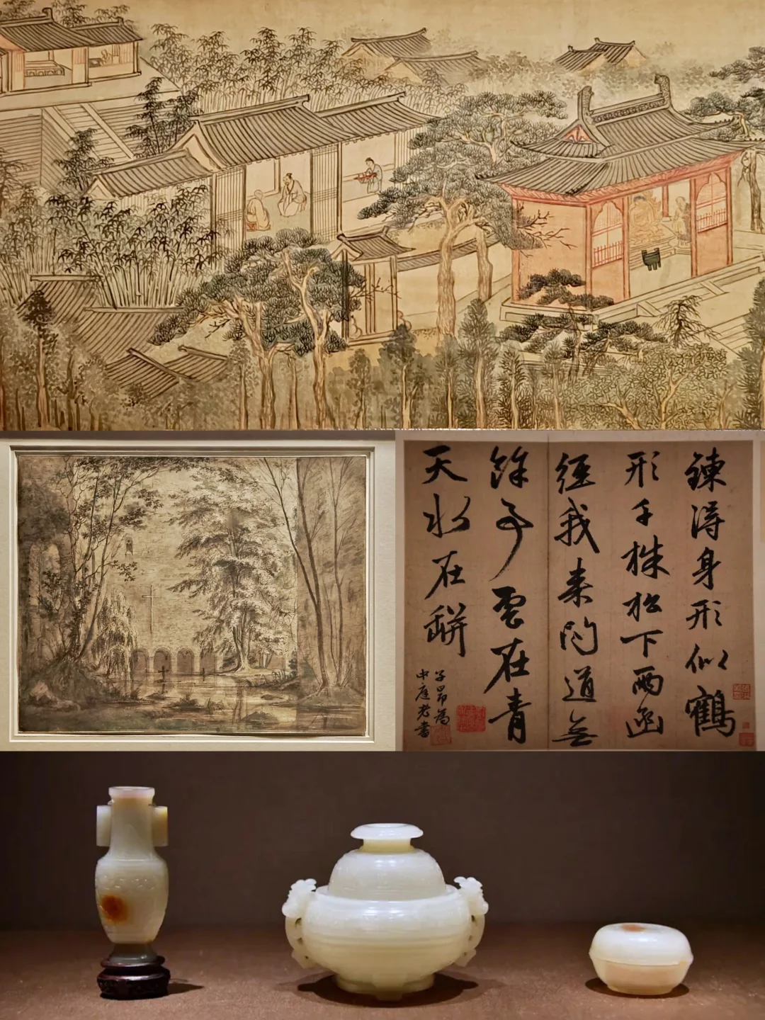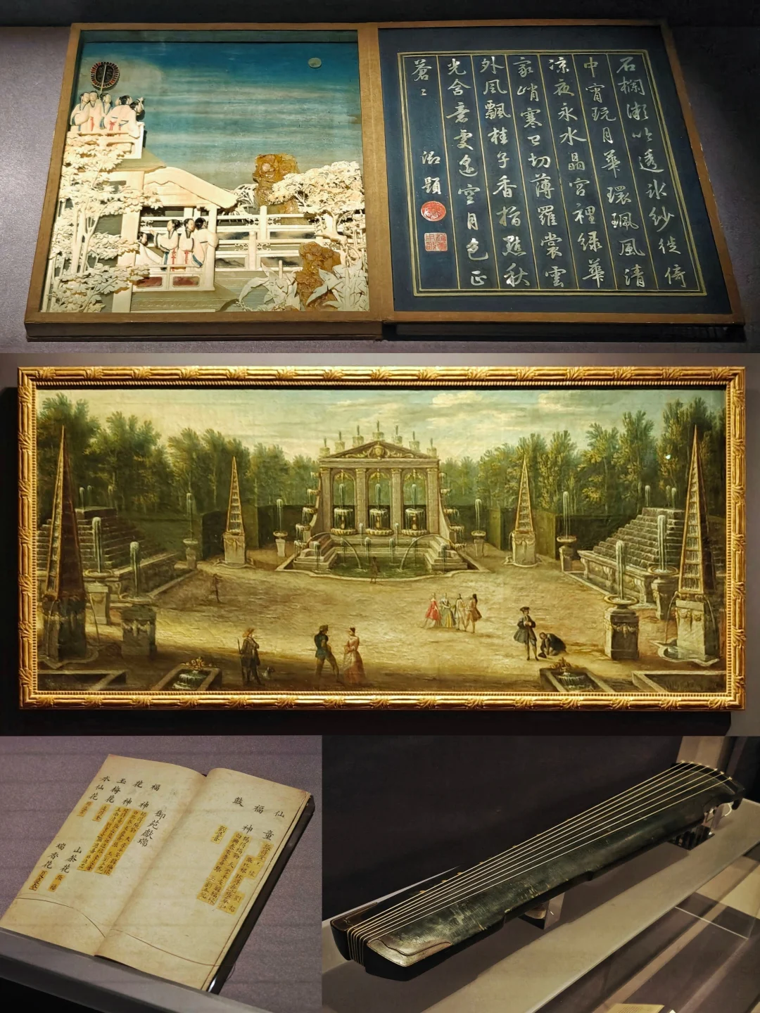 🌺象牙雕月曼清游册:原图为陈枚绘制,以一年12个月的气候变化为背景,描绘宫女们随嫔妃在深宫庭院内外的游赏活动。乾隆很喜欢,让造办处作成了工艺品“百美图”,右侧嵌螺钿诗文,左侧图景以象牙雕刻为主,嵌各种彩石、青白玉、碧玉、红蓝宝石及玛瑙、玳瑁等(确实很乾隆审美)。展出的是八月“琼台玩月”和五月“水阁梳妆”(换过展,之前是另两个月份)