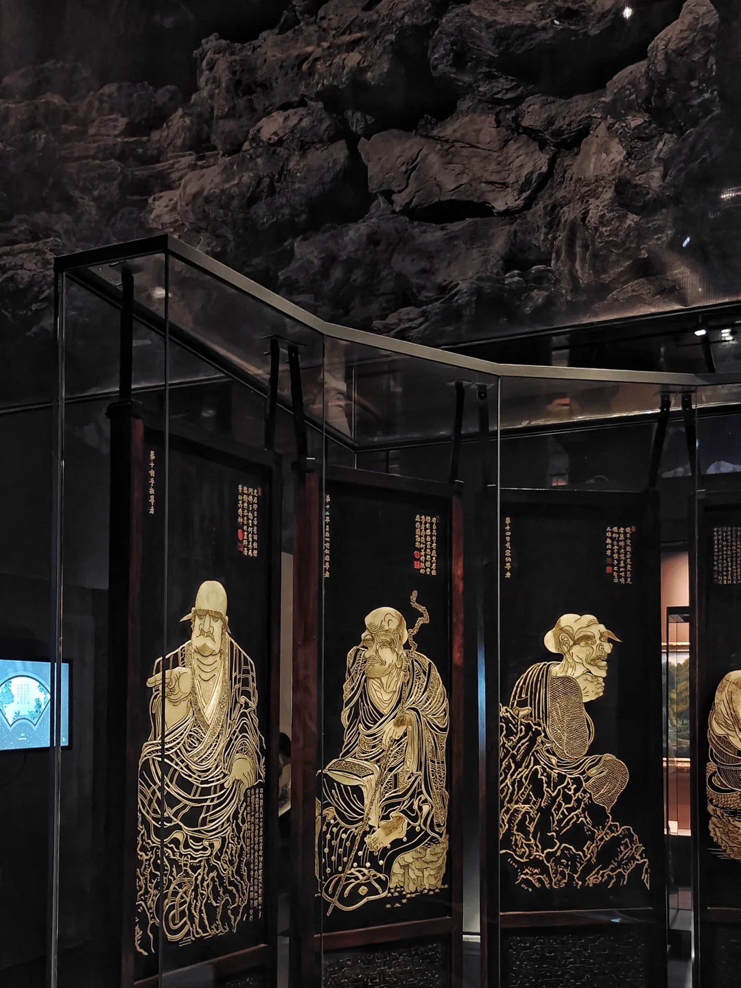 📿乾隆花园内云光楼供奉的十六罗汉屏风:根据五代前蜀画家贯休的十六应真像所制,屏面嵌玉,屏背则漆地描金绘花果植物