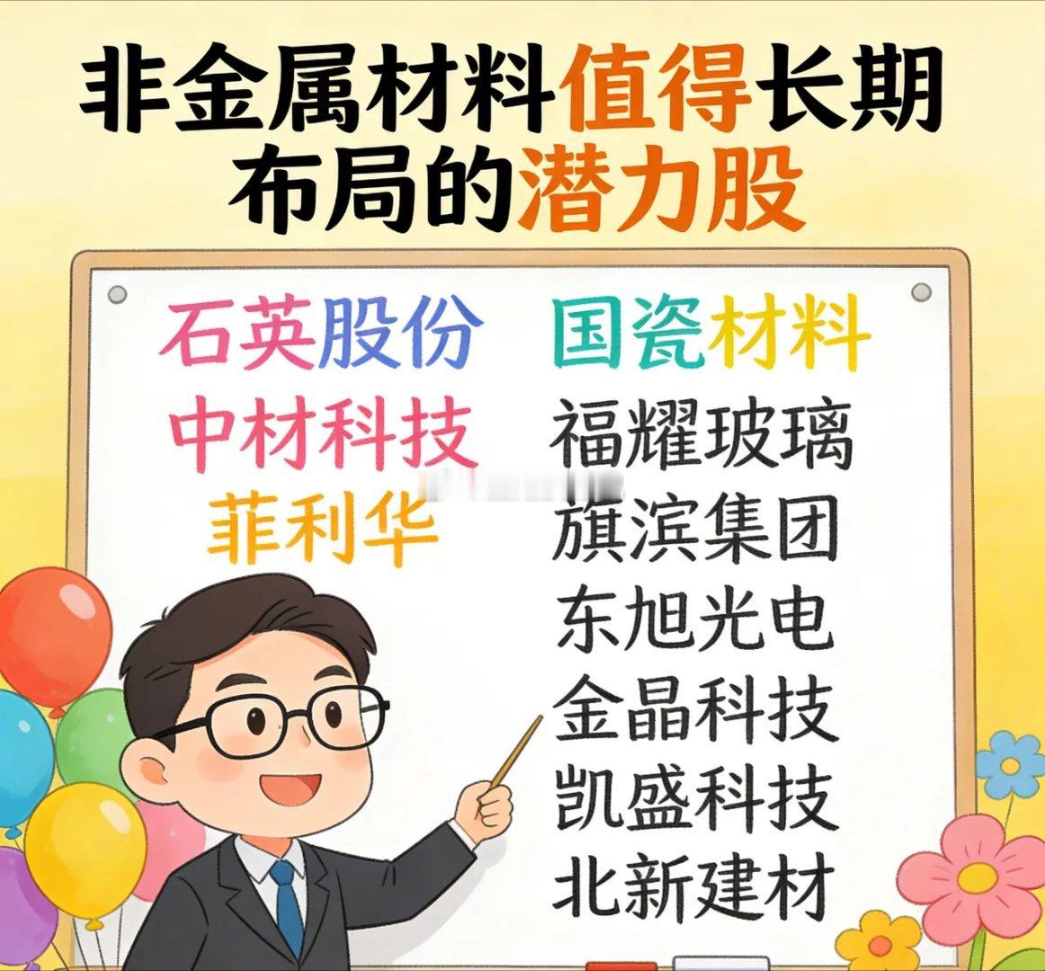 非金属材料,值得长期关注的10支潜力股,具体信息分析如下:1. 石英股份(603688):高纯石英砂王者,掌握光伏用高纯石英砂提纯技术,在N型硅片时代需求大增,且产品向半导体用石英制品延伸,国产替代空间大,客户覆盖隆基、中环、中芯国际等头部厂商。2. 联瑞新材(688300):功能性陶瓷填料龙头,是芯片封装关键材料,受益于IC载板等领域高景气。前三季度归母净利润2.2亿元,同比增长19.01%,业绩稳定增长。3. 索通发展(603612):2025年三季报显示净利润6.54亿元,同比增长201.81%,净资产收益率达12.05%,每股收益1.31元,业绩十分亮眼。公司在非金属材料领域竞争力强。4. 中复神鹰(688295):碳纤维龙头,国内碳纤维干喷湿纺技术引领者,主要产品T700/T800级是轻量化核心材料,深度绑定氢能、航空航天等高速成长赛道,发展前景广阔。5. 江丰电子(300666):半导体靶材龙头,超高纯金属溅射靶材是芯片制造关键材料,客户覆盖台积电、中芯国际等全球大厂,技术实力强劲,随着国产替代推进,成长空间巨大。6. 凯盛科技(600552):UTG超薄柔性玻璃领军者,产品应用于折叠屏手机,背靠中国建材集团,技术储备雄厚,在消费电子创新趋势下,有望迎来业务快速增长。7. 国瓷材料(300285):MLCC介质材料全球领先,拓展生物医疗、催化材料等领域,平台化布局,技术优势明显,市场竞争力强。8. 鼎龙股份(300054):CMP抛光垫国产化先锋,布局半导体显示和封装材料,成功打破国外垄断,实现CMP抛光垫的国产化,成长路径清晰。9. 长阳科技(688299):反射膜龙头,产品应用于液晶显示、半导体照明等领域,技术领先,积极拓展新能源材料市场,发展潜力较大。10. 尚太科技(001301):负极材料新星,产品性能优异,客户资源丰富,产能扩张迅速,市场份额有望不断提升。以上内容均由公开信息整理而得,不构成任何投资建议。