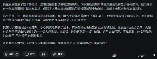 RTX5090送修遭华硕拒保 显微镜级"裂纹"算人为破坏近日国外一位用户申请保修RTX 5090 Astral(夜神)显卡遭到华硕拒保。报道称华硕以“接口处出现裂痕”为由直接拒绝维修,但官方愿意提供50%的折扣进行更换,即便如此也需要高达1700美元的费用。该用户表示,他的ROG RTX 5090 Astral此前出现黑屏、系统重启等问题,于是将显卡寄回华硕申请维修。但华硕检查后称,在 PCIe接口附近发现“表面不规则”。用户强调,他完全不知道显卡寄出前是否存在这道痕迹,因为肉眼无法辨识。华硕据此认定为“人为造成”的损坏,拒绝提供保修维修,并表示显卡无法修复。为更换显卡,华硕向他报价高达3340美元。用户感到极为无奈,他强调自己安装显卡全程规范,还使用了显卡支撑架。不过,华硕也提供了“5折优惠”,用户仍需支付约1700美元才能更换显卡。外媒表示,可以理解官方不会对明显人为损坏提供免费更换,但如果损坏小到只能通过显微镜才能看到,难免让人怀疑厂商是否在尽力寻找任何“人为痕迹”,以便拒绝保修。