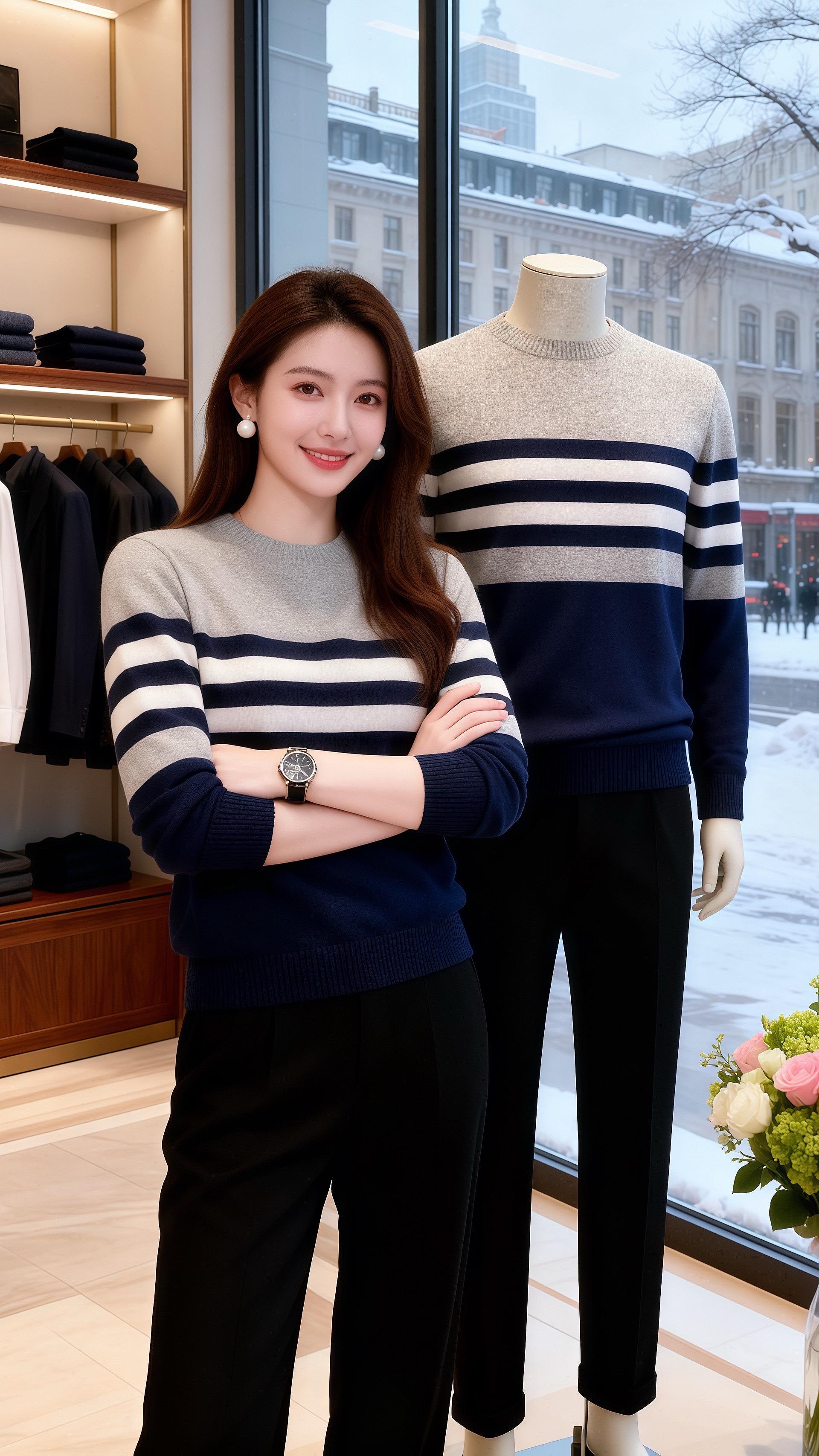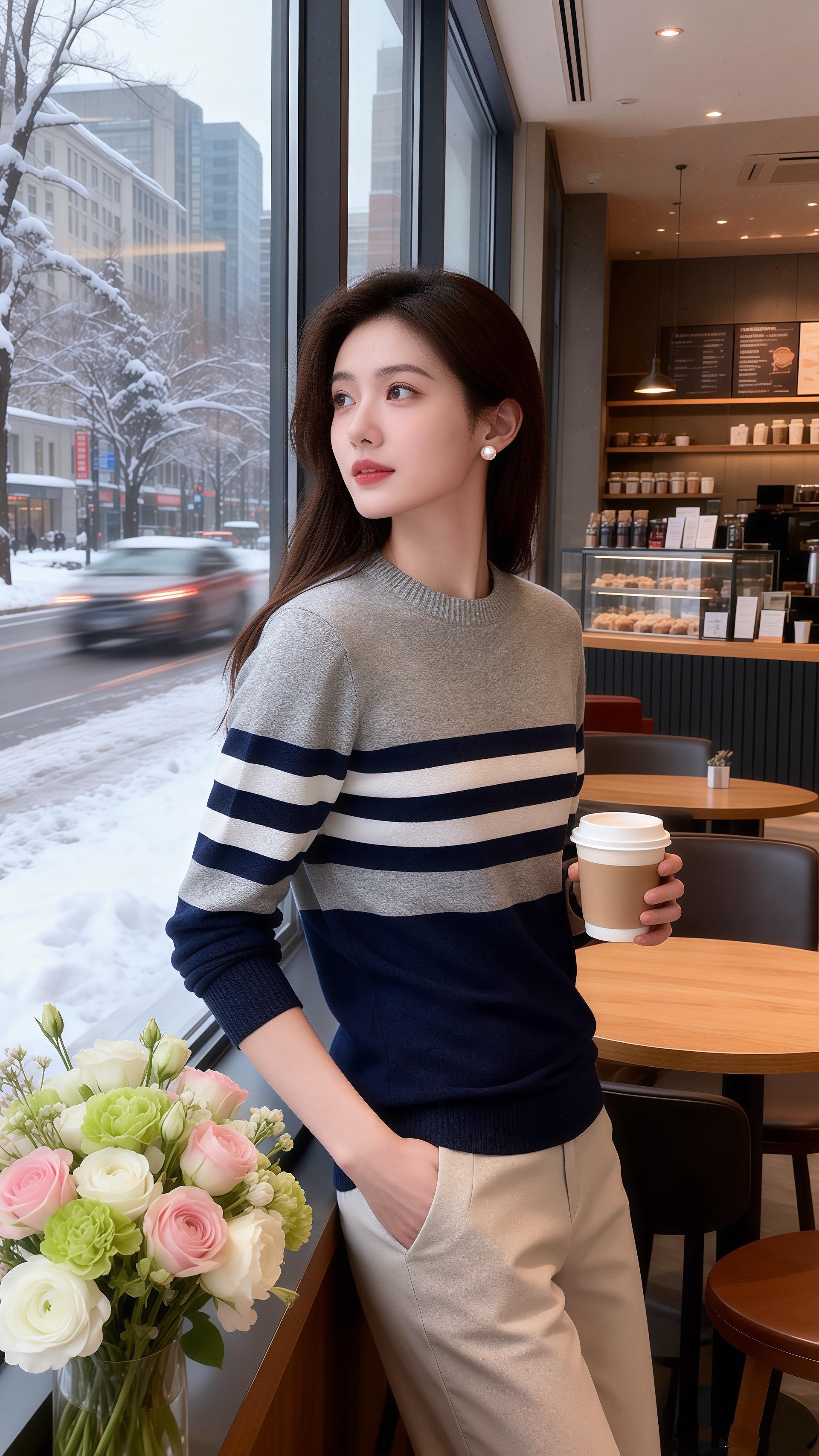 她穿灰蓝白条纹针织衫,细腻的针织纹理贴着身形,灰白与藏青的条纹交错排列,让简约的衣身多了几分层次感,圆领的设计衬得脖颈线条温婉,下摆的藏青纯色部分又添了沉稳的质感。搭配的米白色长裤裤型挺括,和针织衫的柔糯形成对比,整身穿搭像冬日里的海盐焦糖,清爽的条纹糅合着暖调的温柔,连身旁的花束都成了点缀。