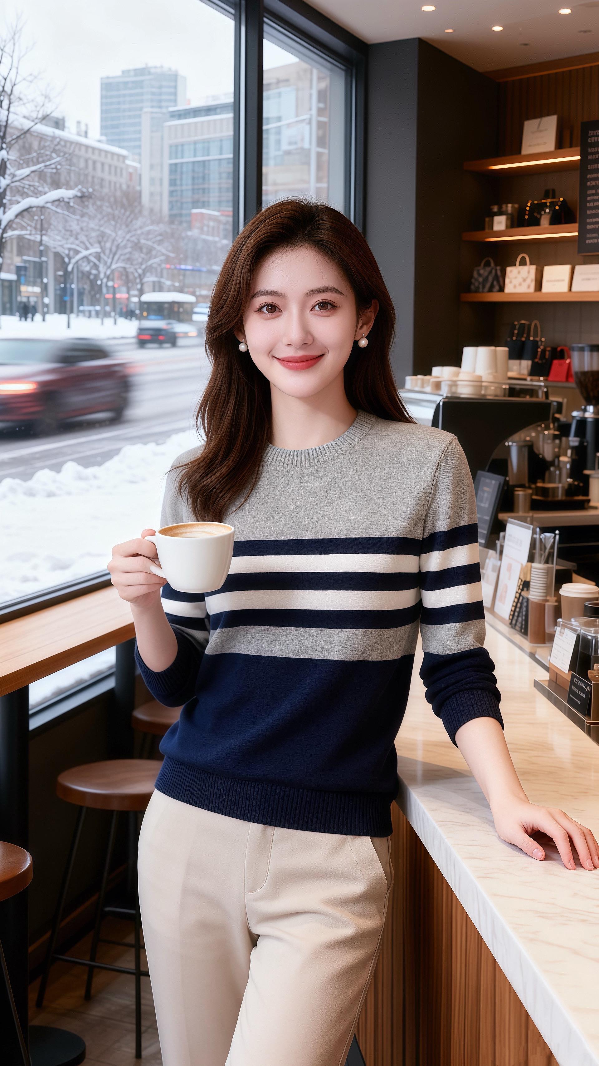 她转头看到我时,把咖啡杯轻轻放在吧台,伸手接过我手里的购物袋。「挑好了?」她笑着替我拂去肩头的雪,指尖擦过我