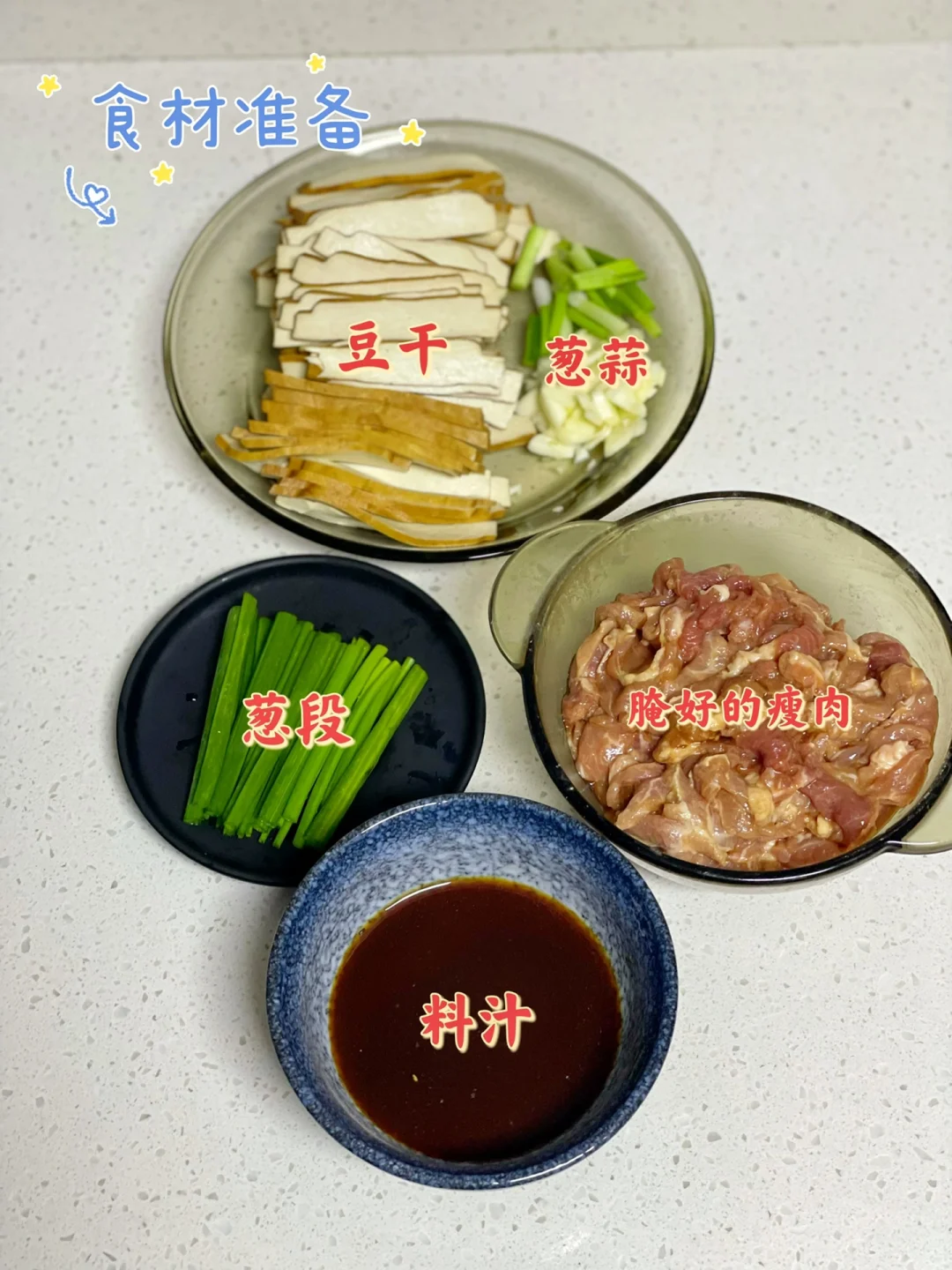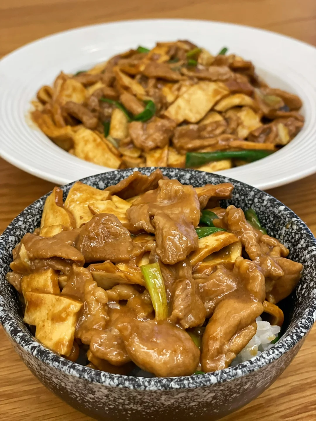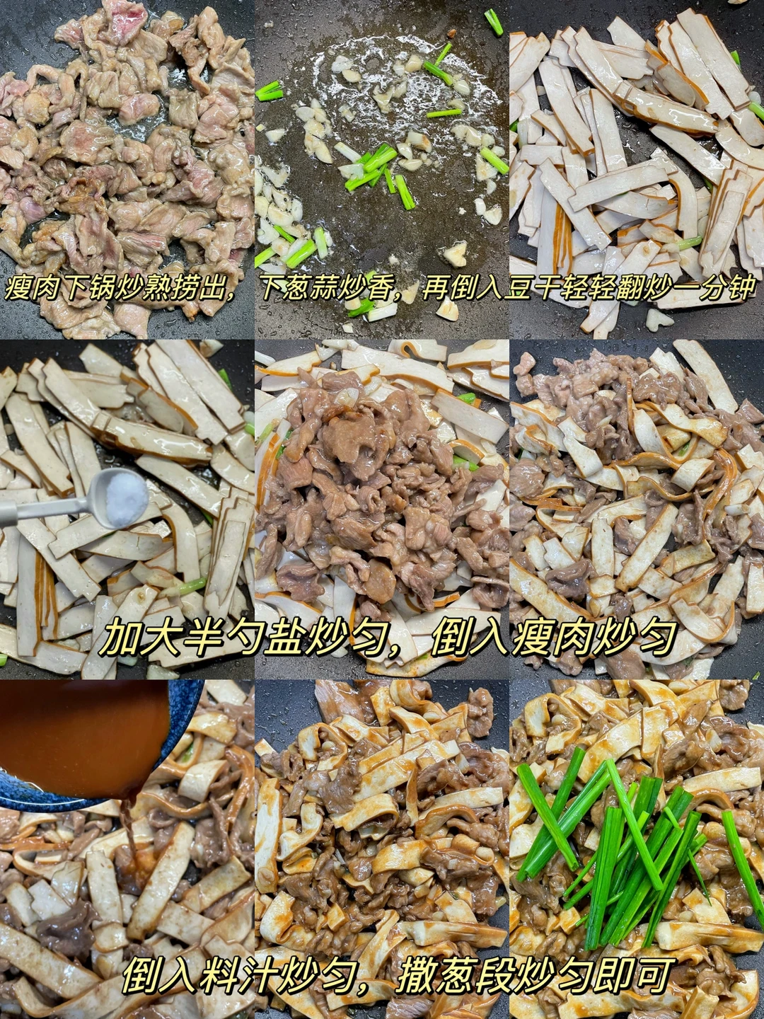 有喜欢吃豆干的吗?豆制品真的是很难不爱,豆干炒肉这道菜以前做过好多次了,是真的好吃😋 🥗食材:厚豆干,瘦肉,大蒜,小葱 1⃣️:瘦肉洗净切成薄片,加入两勺淀粉,一勺生抽抓匀备用,厚豆干切薄片,葱切段,大蒜切片 2⃣️:准备料汁,一勺生抽,一勺鸡精,一勺淀粉,少许清水拌匀 3⃣️:油热下瘦肉滑熟捞出,倒入葱蒜炒香,再倒入豆干翻炒一分钟,加入半勺盐炒匀,倒入瘦肉炒匀,最后倒入料汁收汁,撒上葱段炒匀即可