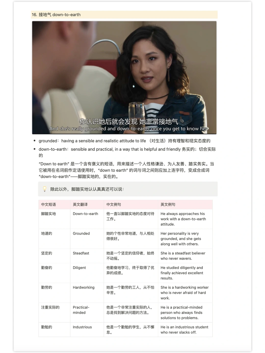 down-to-earth“Down to earth” 是一个含有褒义的短语,用来描述一个人性格谦逊、为人友善、踏实务实。当它被用在名词前作定语使用时,“down to earth” 的词与词之间则应加上连字符,变成合成词 “down-to-earth”——脚踏实地的,实在的。