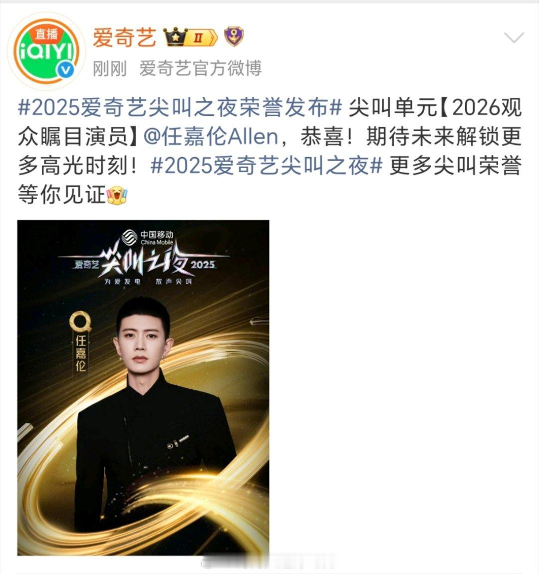 恭喜任嘉伦!斩获爱奇艺尖叫之夜2026观众瞩目演员!国民演员含金量无需多言👍