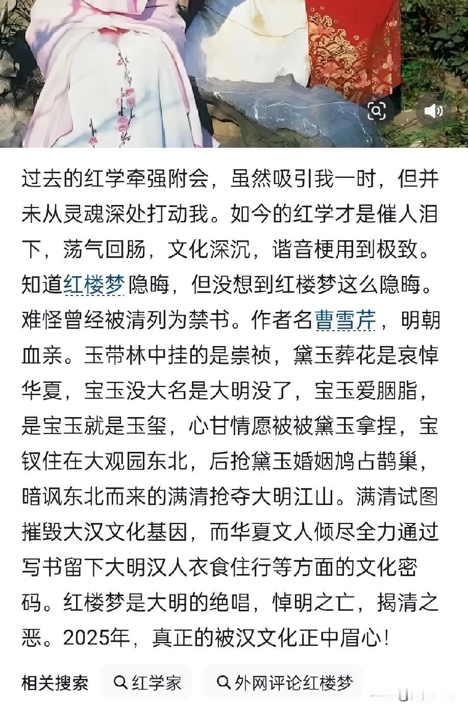 认真细致看完这段文字,我内心久久不能平静,也特别想哭。 过去的红学牵强附会,虽然吸引我一时,但并未从灵魂深处打动我。如今的红学才是催人泪下,荡气回肠,文化深沉,谐音梗用到极致。知道红楼梦隐晦,但没想到红楼梦这么隐晦。难怪曾经被清列为禁书。作者名曹雪芹,明朝 血亲。玉带林中挂的是崇桢,黛玉葬花是哀悼华夏,宝玉没大名是大明没了,宝玉爱胭脂是宝玉就是玉玺,心甘情愿被被黛玉拿捏,宝钗住在大观园东北,后抢黛玉婚姻鸠占鹊巢暗讽东北而来的满清抢夺大明江山。满清试图摧毁大汉文化基因,而华夏文人倾尽全力通过写书留下大明汉人衣食住行等方面的文化密 码。红楼梦是大明的绝唱,悼明之亡,揭清之恶。2025年,真正的被汉文化正中眉心! (图片来源于网络) 吃瓜盟主 红学新解