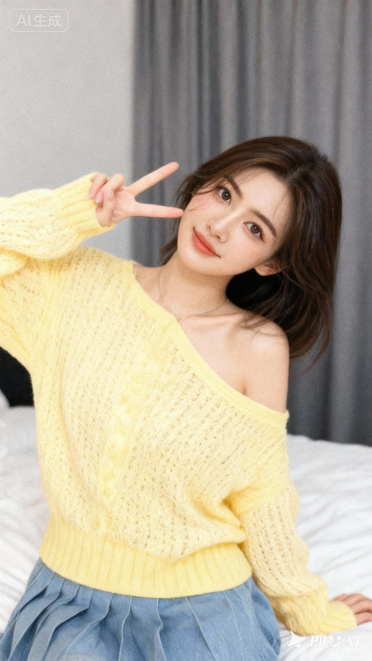 女生对着镜头歪头比耶,碎发轻拂脸颊,妆容清透自然,眼尾带点微醺腮红,背景是简约的卧室 灰色窗帘整体画面带点模糊颗粒感