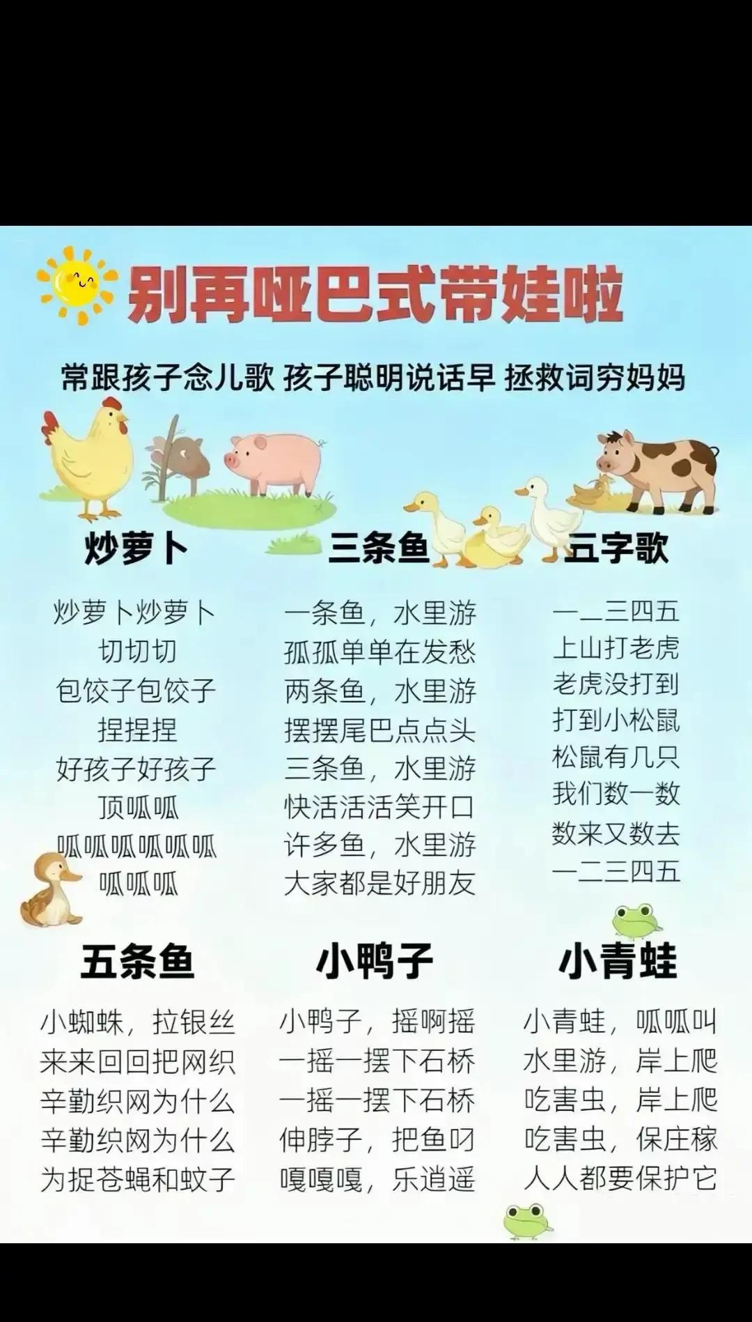 我家娃三个月时我嫌他只会啊啊哭,把摇啊摇搬到床头天天念,念到第七天他忽然盯着我嘴型咯咯笑。 我趁热打铁早晚各十分钟,把月亮船小星星排成串,像报菜名一样往外倒。 六个月体检医生夸他追声快,我暗爽却装淡定。 后来出牙夜闹,我抱着他边拍边哼,他竟跟着节奏蹦出类似“摇”的音,老母亲当场泪目。 现在一岁半,能指着窗外背“一闪一闪亮晶晶”,吐字黏糊却自信爆棚,见邻居就表演,社牛属性全开。 我总结就是口水歌+复读机模式,把大人的嘴变成他的随身WiFi,信号满格,开口自然提速。 坚持念到娃回你话,那份成就感比抢到红包爽多了。 每天三十分钟,嘴皮子动动,就能帮孩子把语言地基打牢,稳赚不赔。
