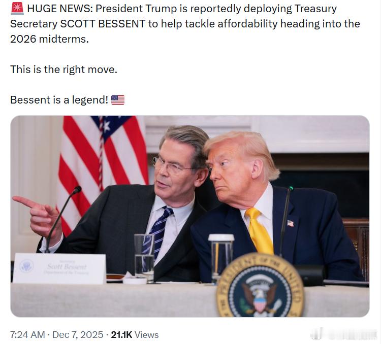 据报道,特朗普总统正派遣财政部长斯科特·贝森特来协助解决通胀与负担能力问题,为2026年中期选举做准备。