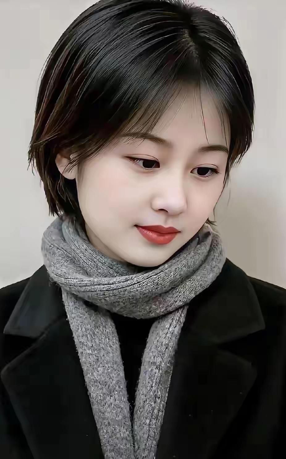冬日暖阳下的温柔少女,黑发红唇,灰色围巾搭配黑色大衣,温暖又时尚。
