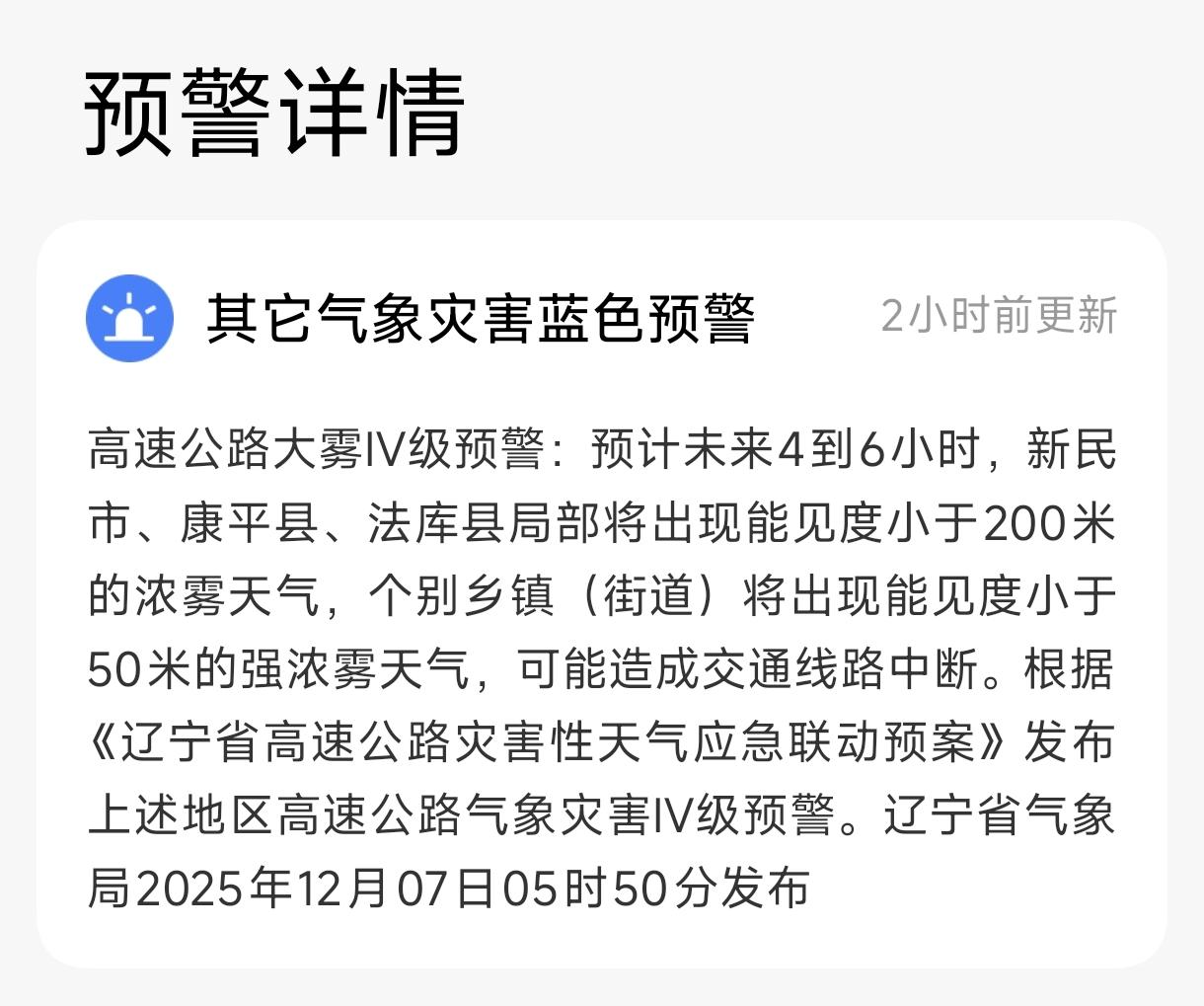 辽宁这三地注意!大雾蓝色预警已发,高速出行要当心⚠️ 刚刚(12月7日05:50)辽宁省气象局发布高速公路大雾IV级预警:未来4-6小时,新民市、康平县、法库县局部将现能见度<200米的浓雾,个别乡镇甚至会出现<50米的强浓雾,可能导致交通线路中断。 近期要走这几个区域高速的朋友,记得提前查路况、减速慢行,千万别赶时间!安全第一~