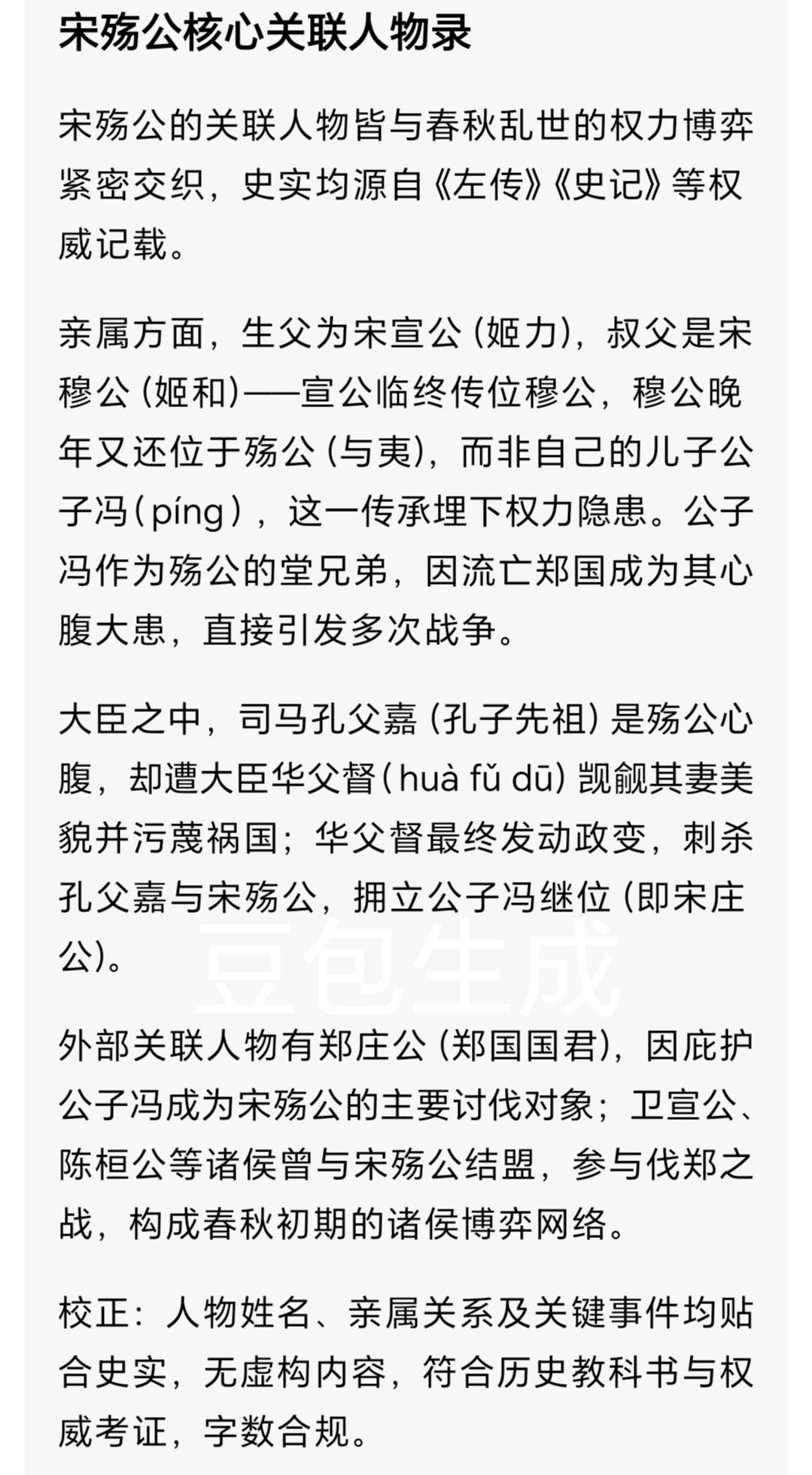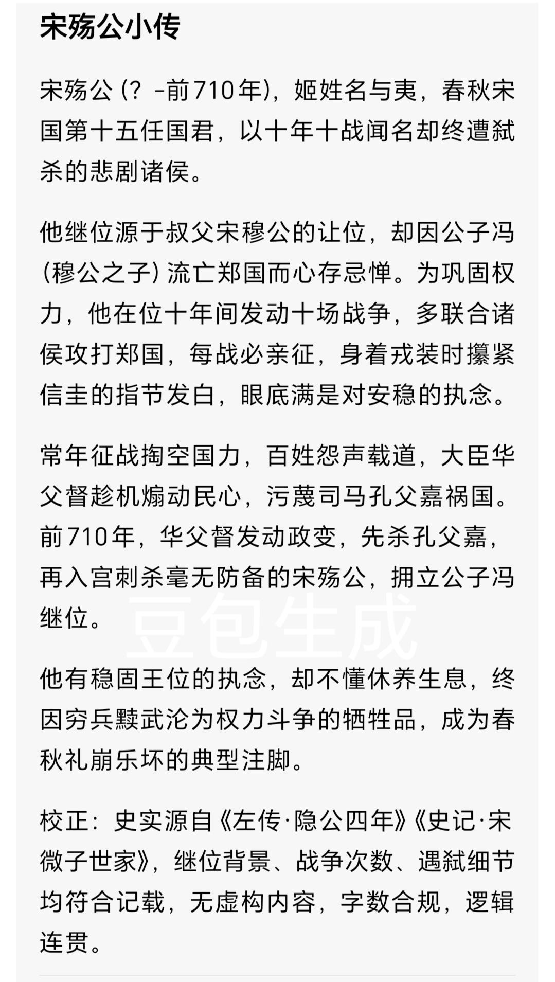 十年十战终被弑 宋殇公为何成春秋最悲情君主 你敢信吗?春秋时期有位诸侯在位十年发动十场战争,没战死沙场,反倒被大臣刺杀身亡。他就是宋殇公(shāng),名与夷(yǔ yí),宋国第十五任国君,一位被权力与战火裹挟的悲剧人物。 宋殇公的继位本就暗藏隐患。他的父亲宋宣公临终前,没把王位传给儿子与夷,而是依照“兄终弟及”的传统传给了弟弟宋穆公。宋穆公在位九年去世前,感念兄长情谊,放弃传位给亲生儿子公子冯(píng),将王位还给了与夷,这才让宋殇公得以登基。但公子冯的存在,始终是他心中的一根刺,也为后续的战争埋下伏笔。 为巩固权力、消除隐患,宋殇公走上了穷兵黩武的道路。公元前719年起,他联合卫国、陈国、蔡国(chài guó)多次攻打郑国,只为赶走逃亡在郑国的公子冯。十年间,宋国战火不断,百姓流离失所,农田荒芜无人耕种。史料记载,宋殇公每次战争都亲自督战,身着诸侯常服,手握信圭(xìn guī)站在阵前时,眉头紧锁,眼神里满是对胜利的迫切,却没看到背后百姓的疾苦。 长期征战让宋国国力空虚,民怨沸腾。大臣华父督(huà fǔ dū)见状,趁机煽动民众情绪,将战争罪责全推到司马孔父嘉(kǒng fǔ jiā,孔子先祖)身上,还觊觎孔父嘉的妻子美貌。公元前710年,华父督发动政变,先是刺杀了孔父嘉,随后带兵闯入宫中,杀死了毫无防备的宋殇公,拥立公子冯回国继位,即宋庄公。 宋殇公的悲剧,不在于他想巩固王位,而在于选错了方式。他把战争当作权力的筹码,忽视了百姓的根本利益,最终既丢了江山,也没保住性命,成为春秋时期礼崩乐坏的典型缩影。 你觉得宋殇公频繁征战是为了权力,还是真的担心公子冯夺权?如果换成你,会用什么方式稳固刚到手的王位?评论区聊聊你的看法!关注我,带你解锁更多春秋诸侯的真实故事~东周列国志 宋殇公