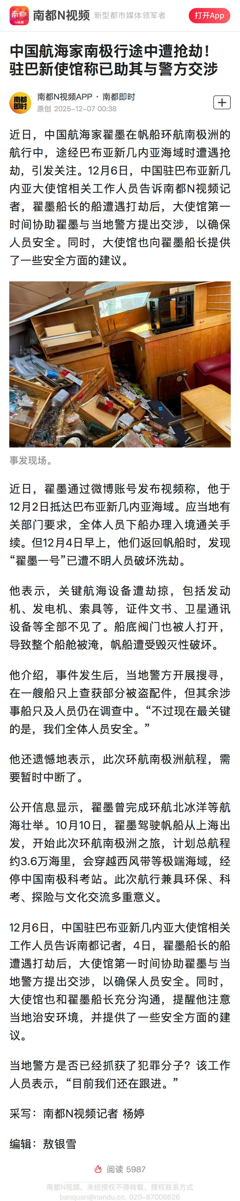 【#中国航海家南极行途中遭抢劫#!驻巴新使馆称已助其与警方交涉】#中国驻巴新使馆协助交涉抢劫案#近日,中国航海家翟墨在帆船环航南极洲的航行中,途经巴布亚新几内亚海域时遭遇抢劫,引发关注。翟墨表示,关键航海设备遭劫掠,包括发动机、发电机、索具等,证件文书、卫星通讯设备等全部不见了。船底阀门也被人打开,导致整个船舱被淹,帆船遭受毁灭性破坏。他还遗憾地表示,此次环航南极洲航程,需要暂时中断了。公开信息显示,翟墨曾完成环航北冰洋等航海壮举。10月10日,翟墨驾驶帆船从上海出发,开始此次环航南极洲之旅,计划总航程约3.6万海里,会穿越西风带等极端海域,经停中国南极科考站。此次航行兼具环保、科考、探险与文化交流多重意义。12月6日,中国驻巴布亚新几内亚大使馆相关工作人员告诉南都N视频记者,翟墨船长的船遭遇打劫后,大使馆第一时间协助翟墨与当地警方提出交涉,以确保人员安全。同时,大使馆也向翟墨船长提供了一些安全方面的建议。当地警方是否已经抓获了犯罪分子?该工作人员表示,“目前我们还在跟进。”南都N视频记者 杨婷